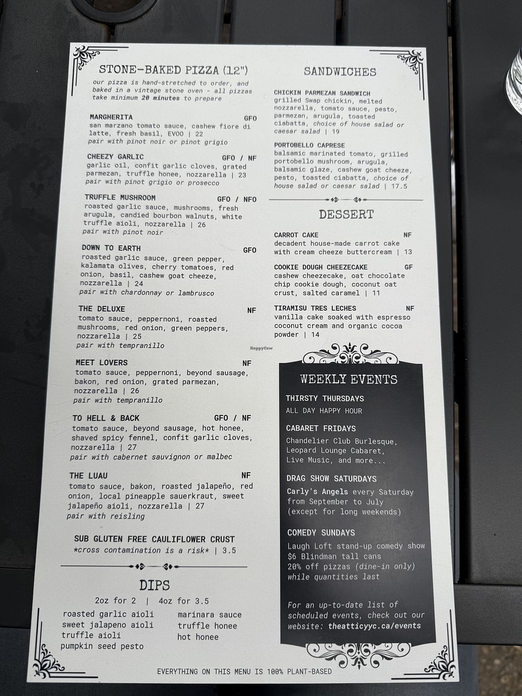 The attic makes the best vegan pizza, pasta, and cocktails. I absolutely love their lemon “ricotta”, carbonara pasta, and the truffle ravioli. They often have special dishes for the month (October specials are so good)! They always have fun events going on, so make sure to check their calendar before you go. Super cute atmosphere and the staff is so nice