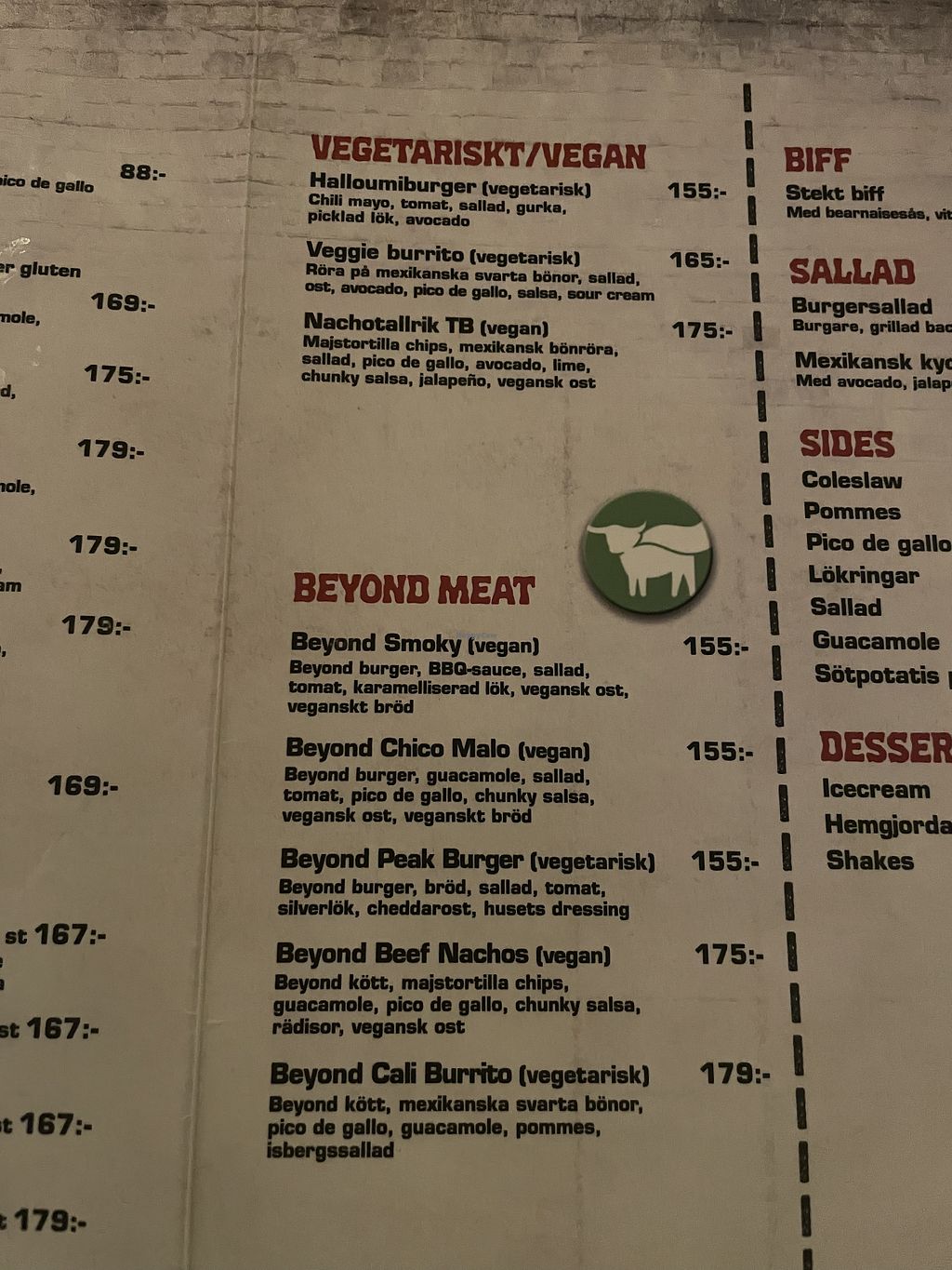 Serves meat, vegan options available. A Mexican and American restaurant offering a vegan menu with options such as two different Beyond burgers, a nachos plate, and Beyond beef nachos. Please note that many businesses in Sweden are cashless. Open Mon 12:00-20:00, Tue-Wed 11:00-21:00, Thu-Sat 11:00-22:30, Sun 12:00-22:30.