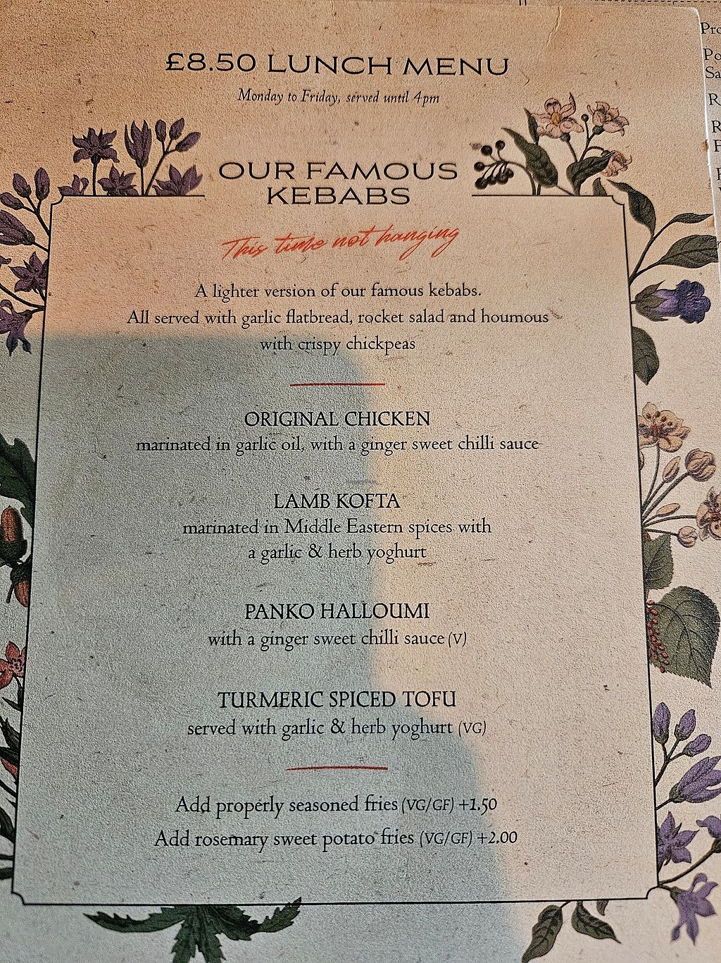 I had the the vegan tofu kebab from the lunch menu and it was delicious. So good to see a different vegan option. The lunch option was half price so great value too.