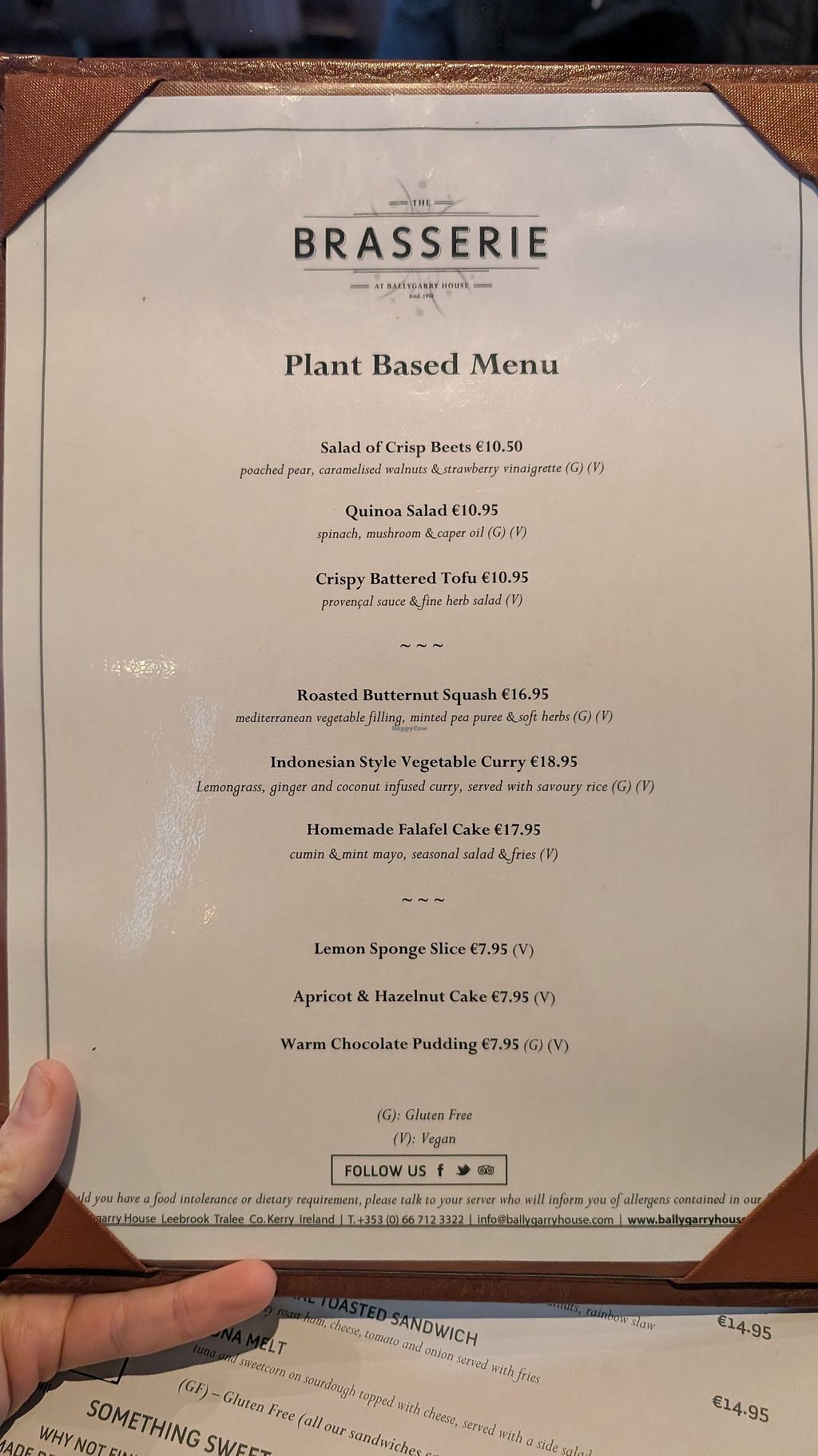 Great to see a new separate vegan menu for the Brasserie at the hotel. Mains options have curry, Butternut Squash and falafel cakes.