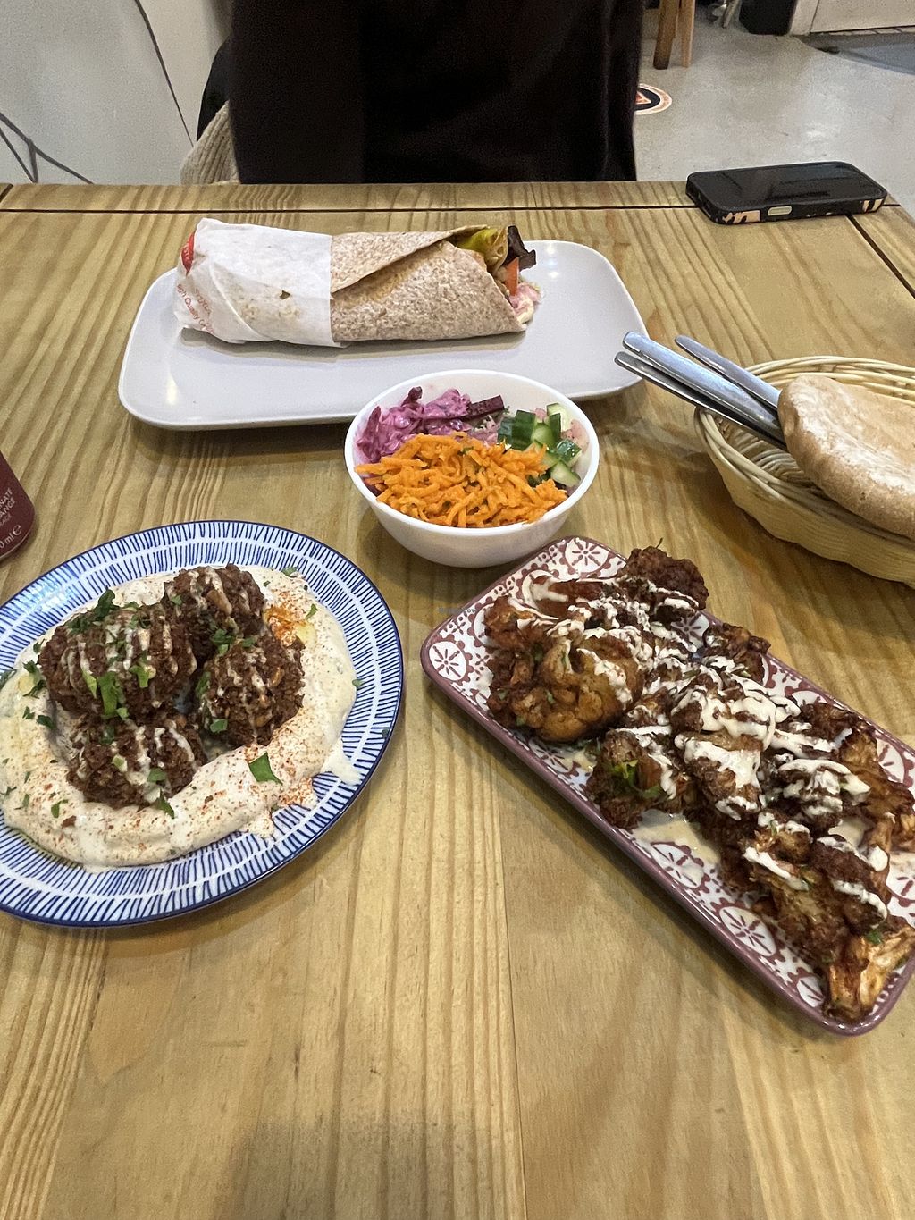 Helpful staff. I tried the falafel wrap with lemon and coriander hummus. The falafel were warm and nice. I should have done a pitta instead. I bet that’s nicer. I also tried the cauliflower which was good too with a drizzle of tahini. It was all about £12 and included a drink. Decent and very filling lunch. I had to take half away.