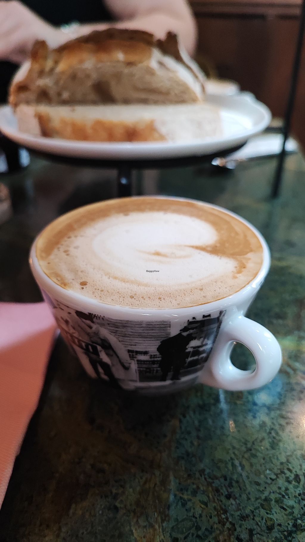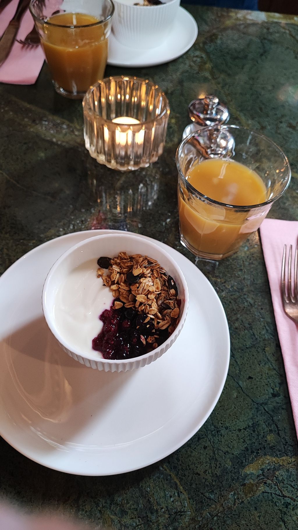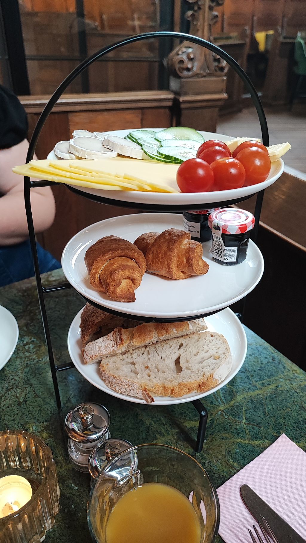 The more I was surprised when the server came, it almost looked like a high tea. Freshly baked croissant and pancakes, good breads, jam, vegan butter, some vegetables, and even excellent cheese. Juice and coffee with plant-based milk, of course.