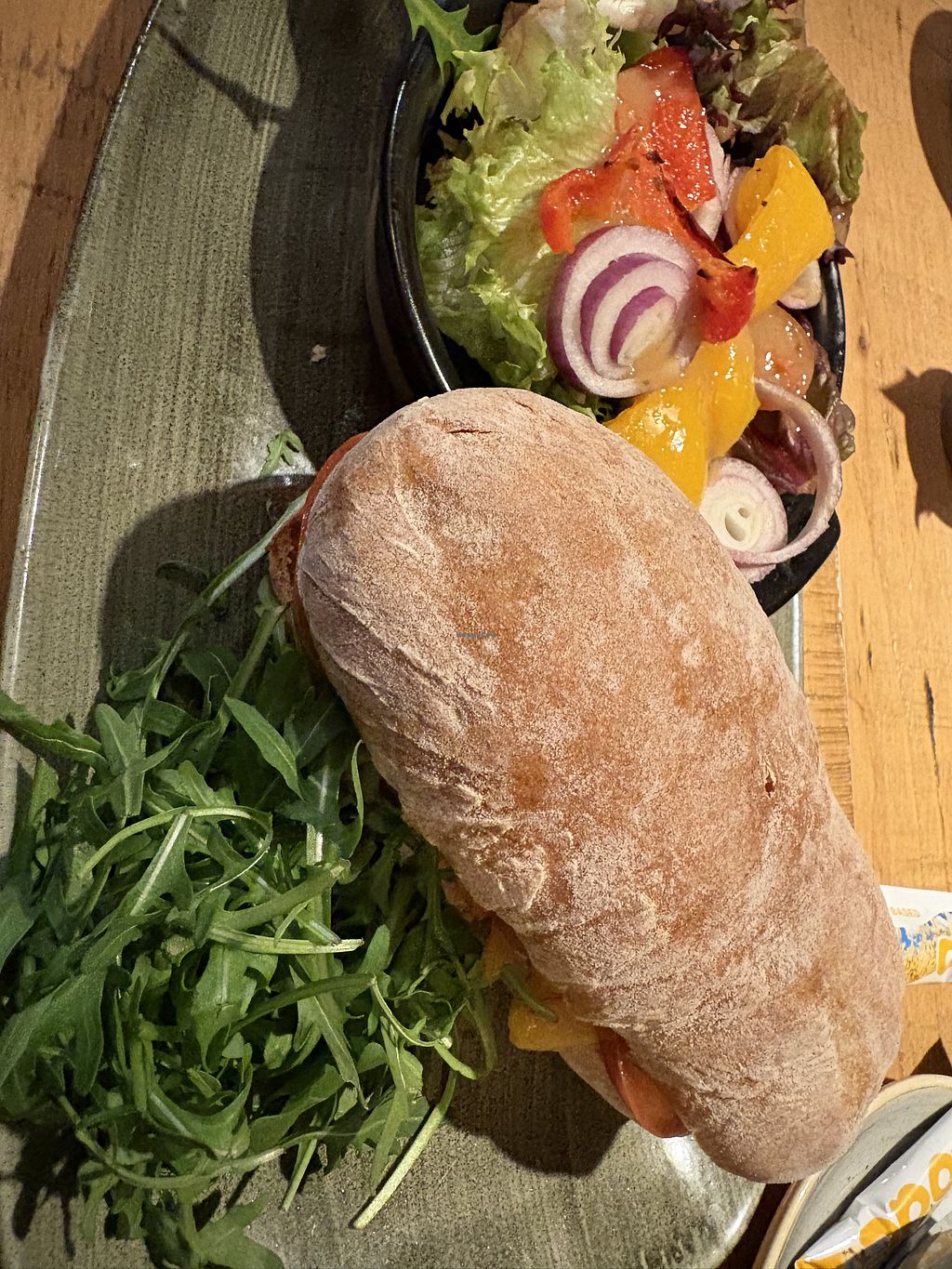 Stopped on way home from a trip for lunch. Waiting staff really knowledgeable. Several vegan options incl one of the daily specials. Opted for baguette. Full of tasty roasted Mediterranean veg. Skin on fries , salad and a tasty salsa replaced the coleslaw. Will definitely return again.