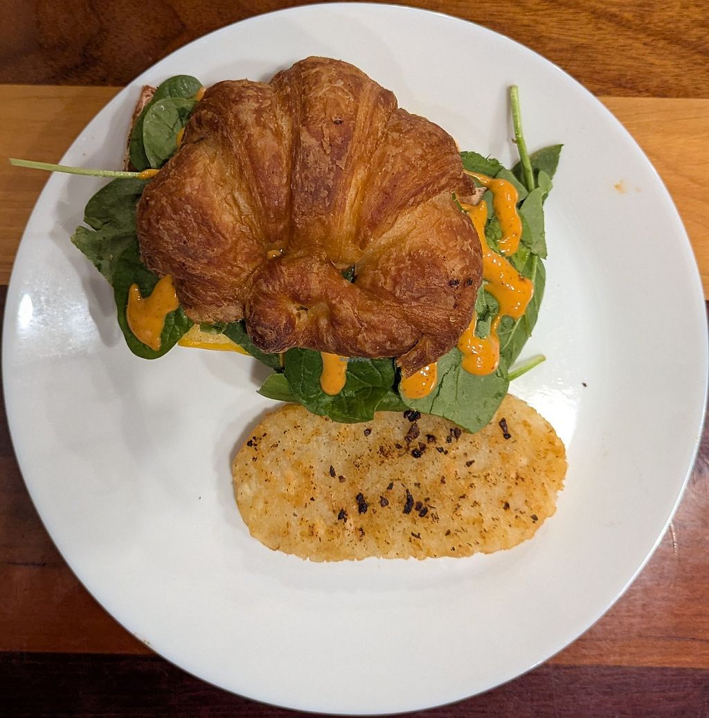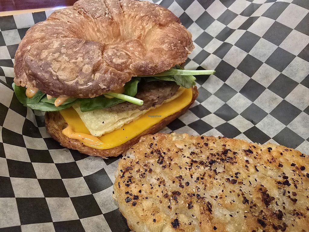 The flavorful Tofu Scramble included tofu, black beans (or Beyond Steak), spinach, vegan cheese, and sweet-chili smoky shiitake sauce, and was served with a crispy hash brown patty. Unfortunately, there were no baked goods when we visited.