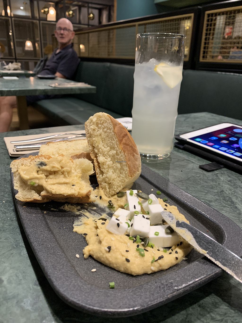 Wir haben als Starter Humus mit veganem Fetakäse bestellt. Das Gericht kam sehr schnell, allerdings fehlte etwas. Wir reklamierten bei der Bedienung, wo der Feta sei. Nach kurzer Rücksprache mit der Küche bot man uns an kostenlos einen alternativen Starter zu bestellen, da der Feta aus sei.