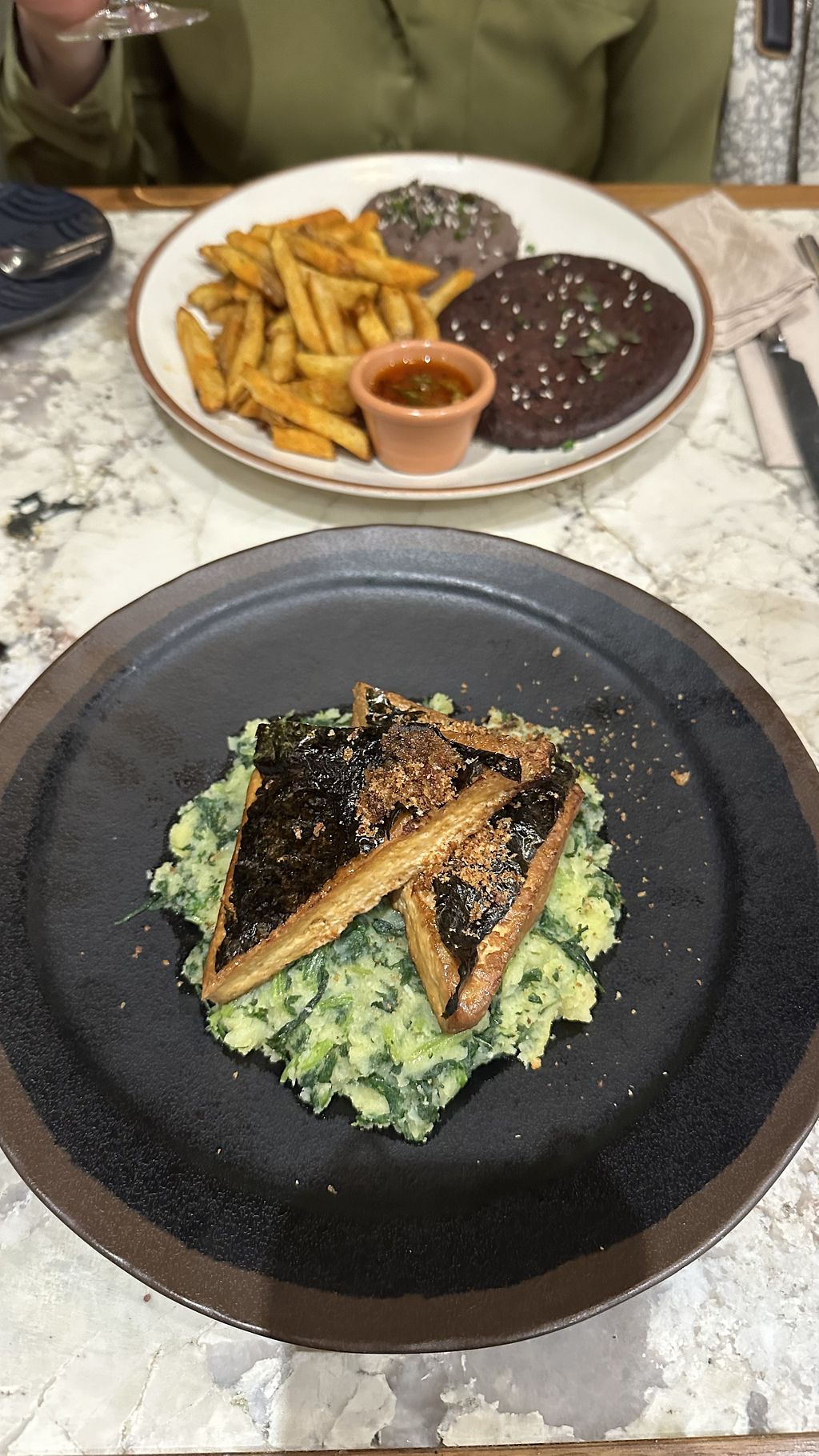 Chill out ambient, nice people. Menu it’s the best cause it’s not too much option, but with mang different taste. Good option at lunch with cheap price. I ate cauliflower fried with bbq sauce and the special tofu a Lagareiro, tasting like a fish, (it was very good!) and a penuts mousse. A good experience and “we must not to be ashamed to eat vegetables”