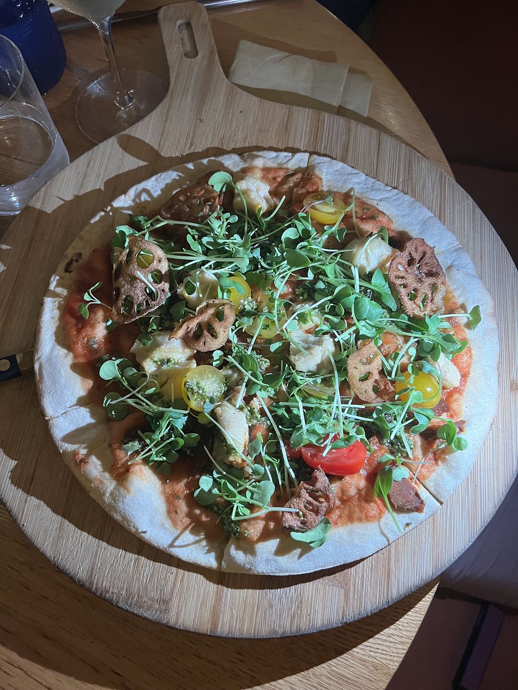 Enjoyed the kale crisps and endvine for starters and the vegan pizza for main (which had pumpkin sausages on and it was beautiful!). Chosen dessert was the chocolate cake with pistachio ice cream.
