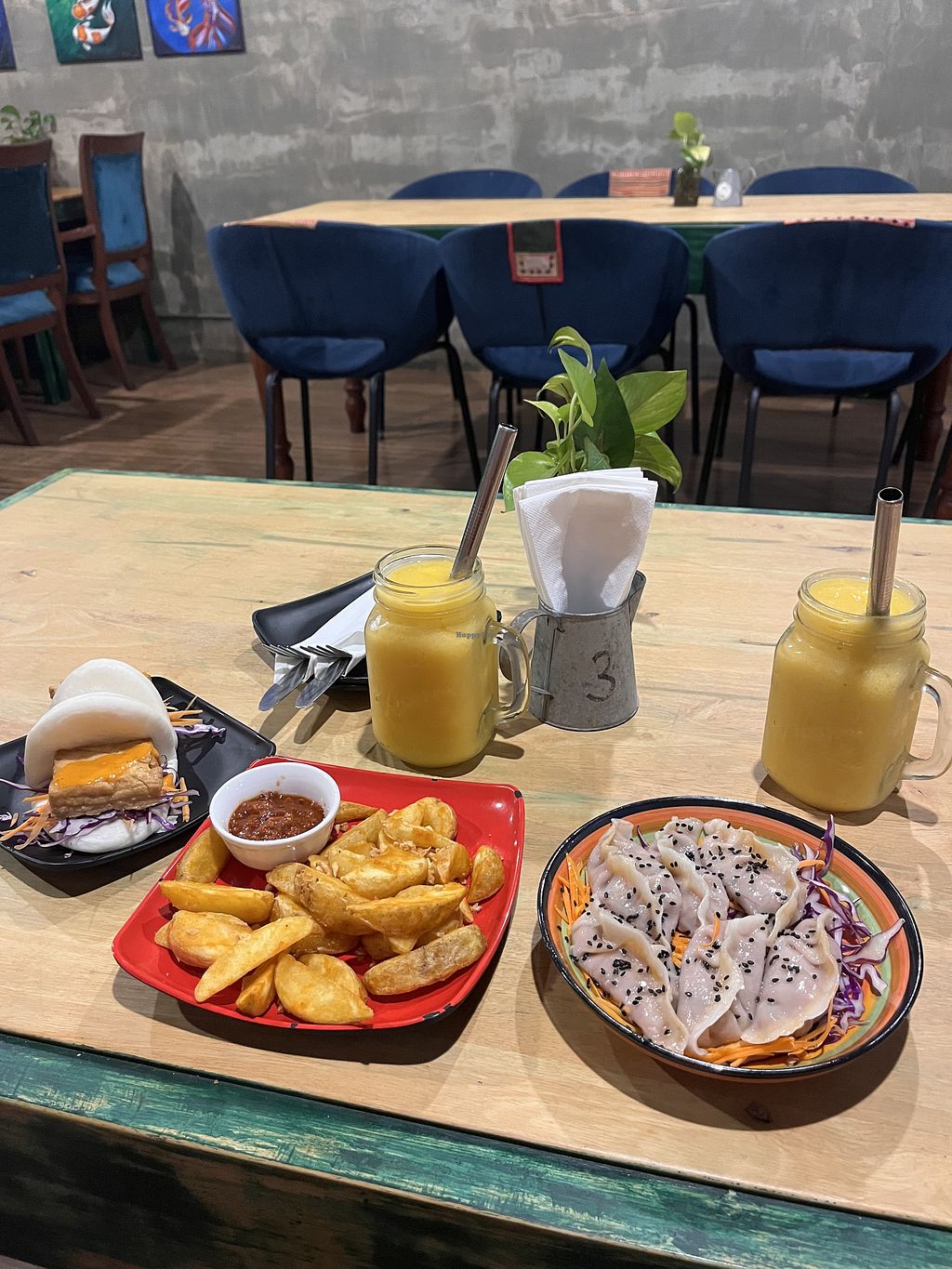 I had the veggie wrap. Didn’t taste that much tbh… also ordered a fruit shake which was quite watery. was expecting more considering the price. My bf ordered a chicken burger and that was also quite dry and just fried pieces.