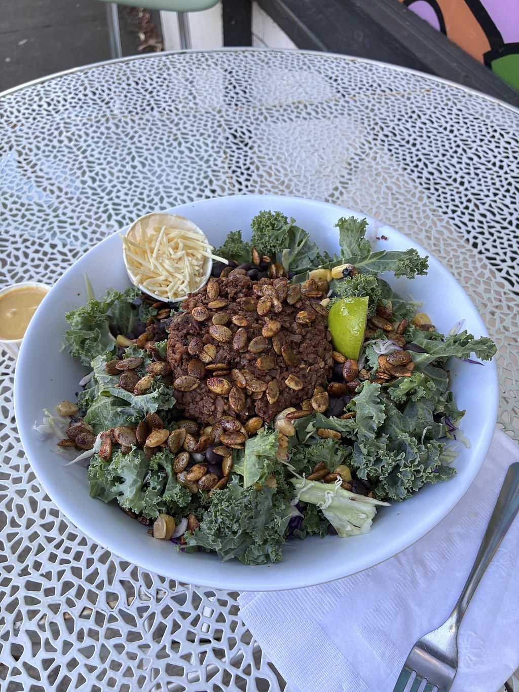 I ordered the Chipotle Kale Caesar Salad, which includes chopped kale, shredded cabbage, black beans, corn, cauliflower “meat," vegan parmesan, and smoky pepitas in a creamy, garlicky dressing. The "meat" had a good flavor and did not taste like cauliflower. Overall, a big, tasty salad.