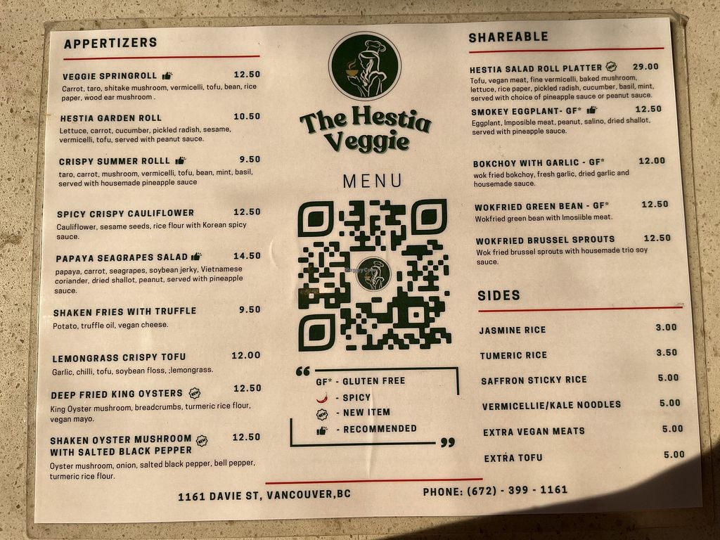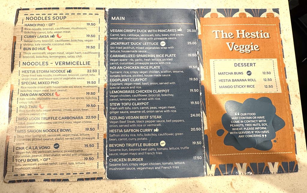 A lovely, welcoming spot with super-friendly staff! We had spicy, crispy cauliflower and deep-fried king oyster mushrooms as appetisers - both with delicious sauces! For mains, we had the Hestia Saffron Curry, Miss Saigon Noodle Bowl, and Hestia Storm Noodle. Each dish was thoroughly enjoyed with lots of vegetables packed in. A special mention for the deep-fried spring roll paired with the Miss Saigon noodle bowl and the house special sauce with the Hestia Storm, as it was full of flavour! Also, we were happily surprised when the Hestia Storm arrived with ‘floating’ noodles and chopsticks! Overall, it was a delicious meal out with lots of flavour.