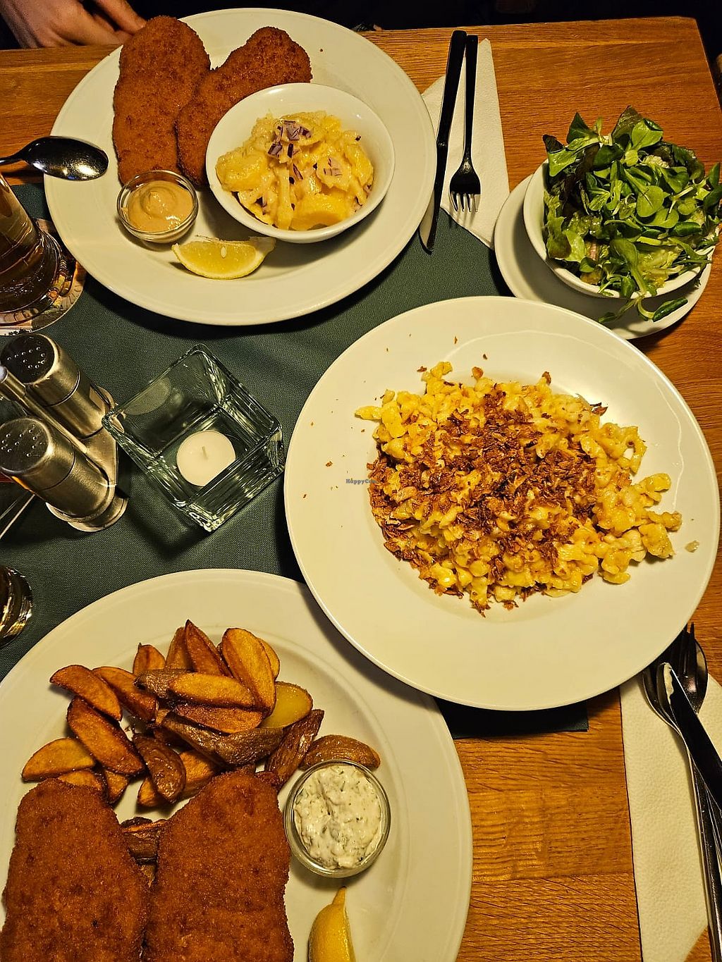 The vegan Schnitzel is nice, but you have to order it without tartare to make it vegan. My partner had a vegetarian Spätzle.