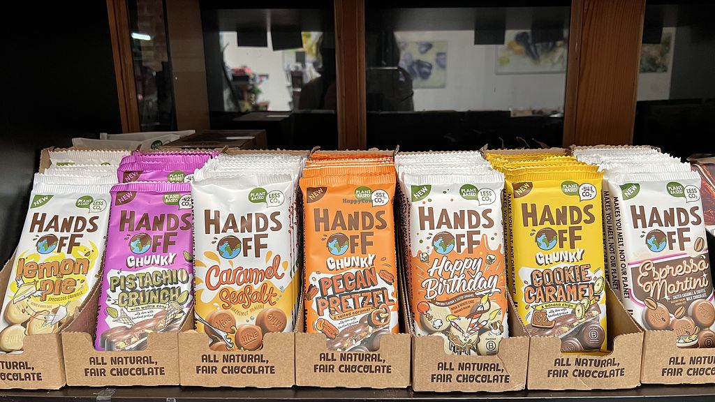 Around the bar, they sell lots of vegan products like sweets, plant milks, artwork, and more — such a cool touch!
