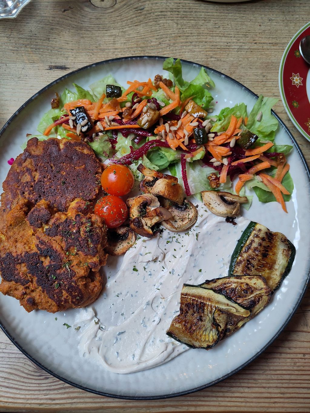 Pros: Friendly staff, Wide choice including seitan schnitzel