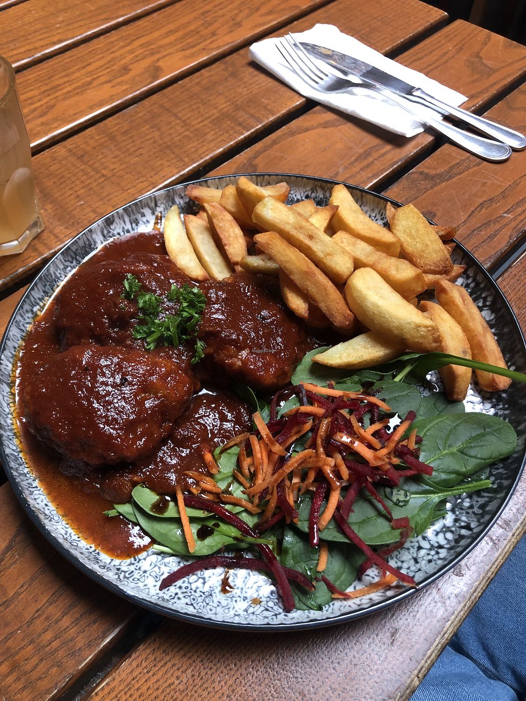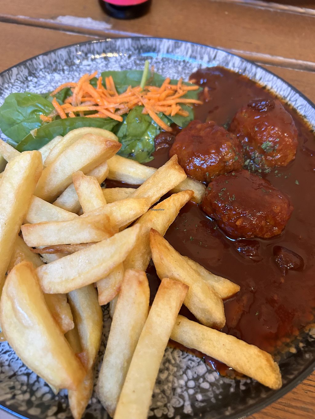 The meatballs and the sauce were really disgusting taste wise and the consistence. Fries were good, salad was good.
