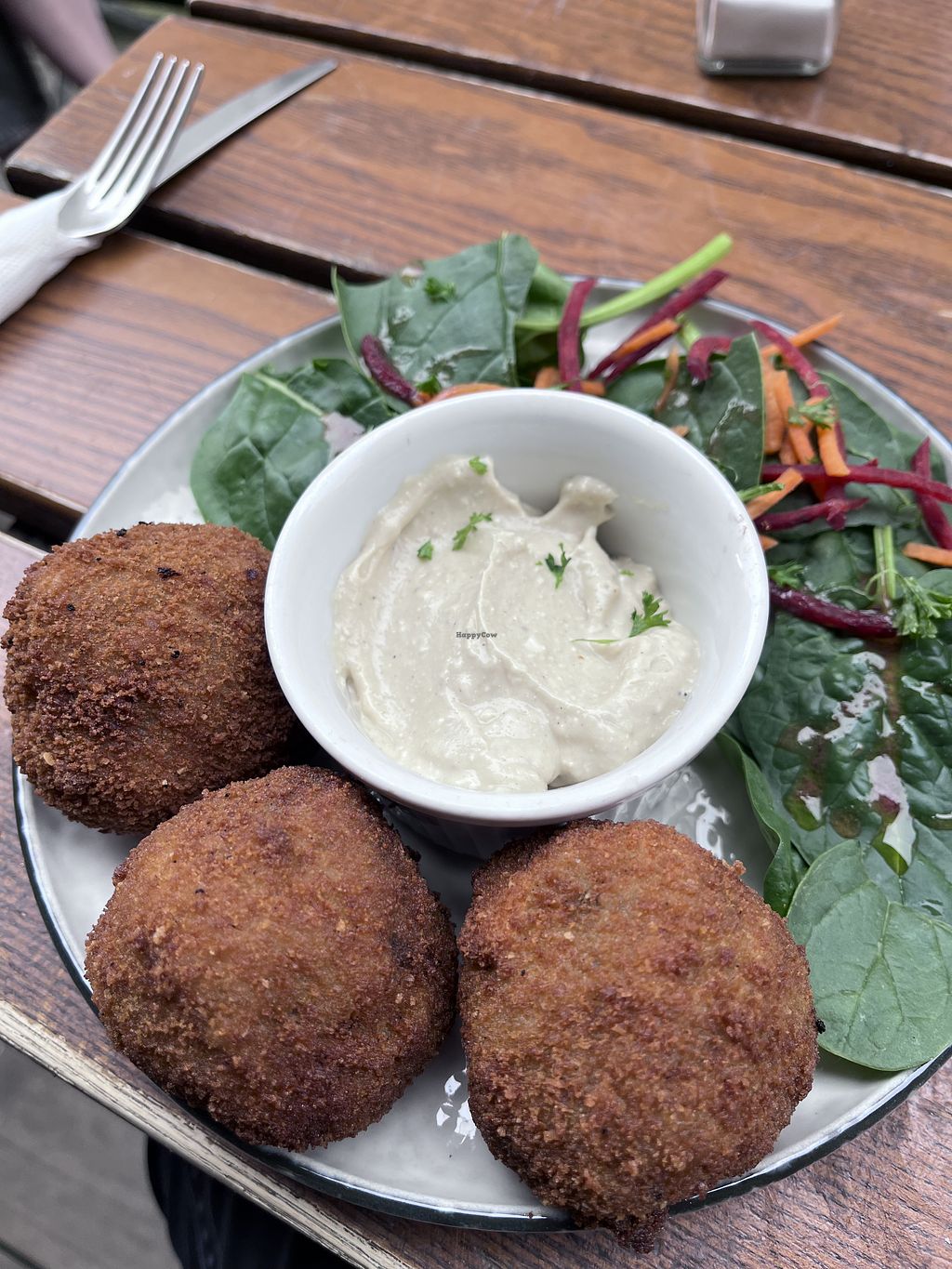 That was the worst vegan meal! my friend waited over half an hour for his milkshake. Others who came after us were served drinks. I took a cheese fondue. and got cold side dishes with cold potato slices, sausage slices and mushrooms. They were supposed to be warmed up in the cheese fondue, but the cheese fondue itself wasn't even hot. The candle that was at the bottom was almost empty and it went out shortly after serving. I let the staff know and they gave me a new candle and warmed up the side dishes again, but it was still cold so I had to ask again if they could please warm it up. Only then did they fry the things and the potatoes, mushrooms and sausages were warm. In terms of taste, the side dishes were not seasoned and were really not tasty. The cheese fondue didn't taste like cheese and was really not tasty. I just found the price-performance ratio to be very bad. The fondue with a few potato slices, 4 sausage slices and a few mushrooms cost €18.50! I started eating where my friend had already finished his burger. the burger was okay. I felt more sick after eating than feeling full and happy. But the staff was very friendly to our dog.
