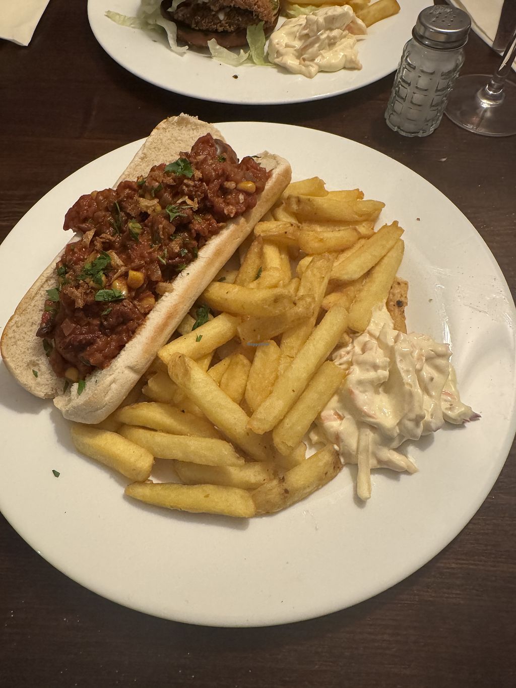 Lovely pub on the broads with olive starter and chilli dog main with fries and coleslaw