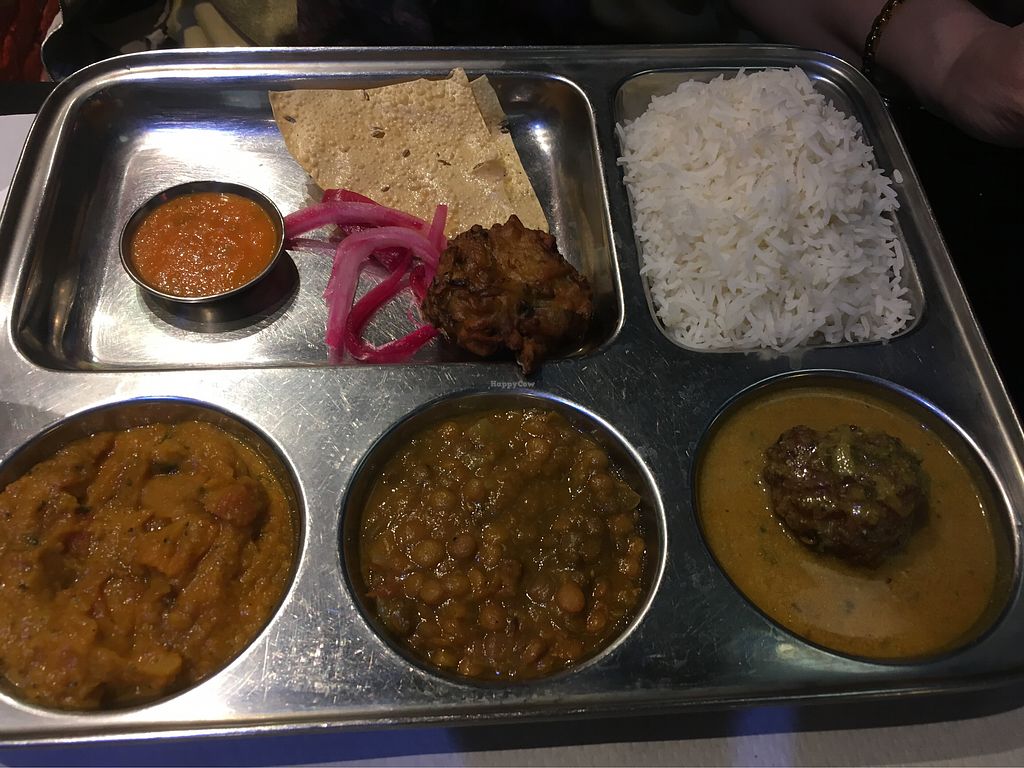 The food here is exactly the same as their first restaurant. All vegan, but not especially tasty. They put a few shards of a papadom on the thali plate. They will not give you tap water - so you have to buy a large bottle of water.
