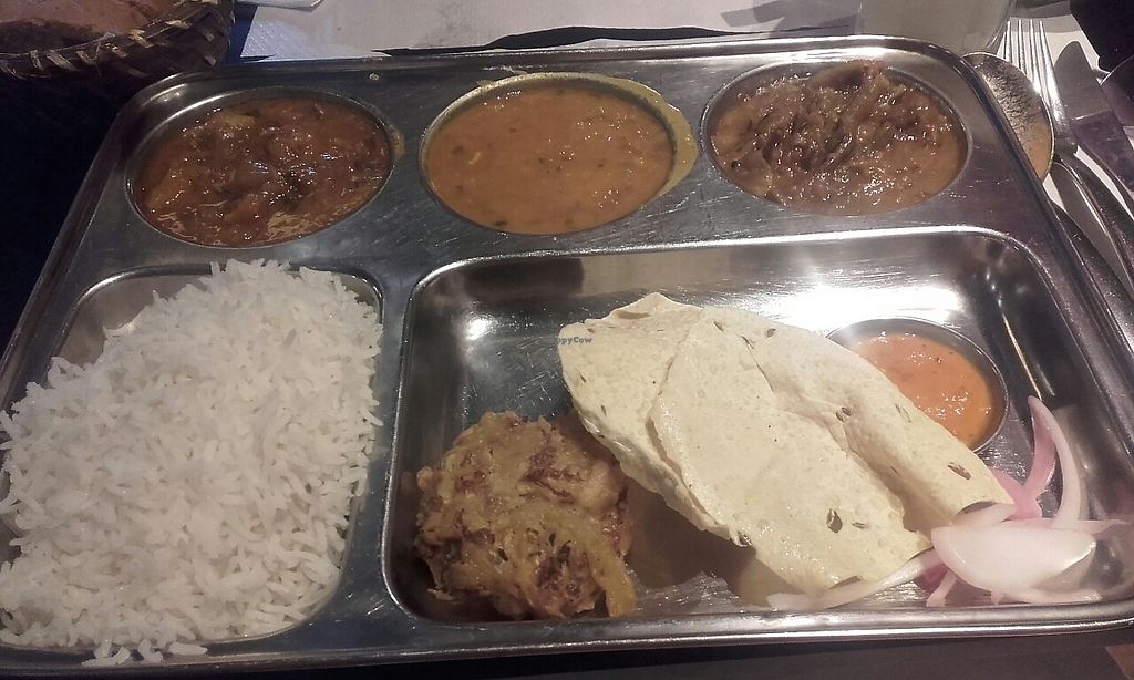 Serves meat, vegan options available. Previously known as Veggie Garden, a fully vegan establishment, but reported October 2025 to serve meat and other animal products. Vegan choices are marked on the menu, including dishes like onion bhaji, pakora, tikka masala with Heura brand vegan meat and more. Specify vegan, just in case. Open Mon-Sun 12:00-23:00.