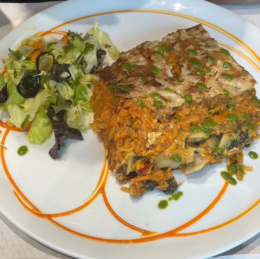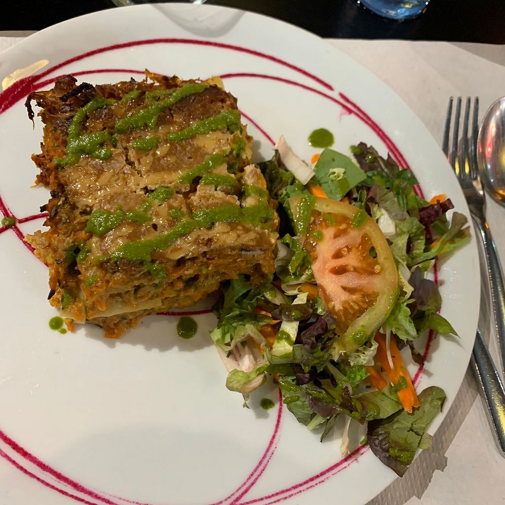 We had the daily menu which was a good price but wasn’t great. For starters my partner had hummus and I had polenta. The basket of bread was extremely dry so we didn’t eat it. For main course we both ordered calzone. The texture of the dough was a little strange (like it had been microwaved(?). I thought the veggie filling was nice until I reached the vegan cheese. I really didn’t like the flavour at all, sorry. We had crumble & chocolate mousse for dessert. Again not great. So based on our experience, I’d give it one star but I’m adding one purely because it was very cheap.