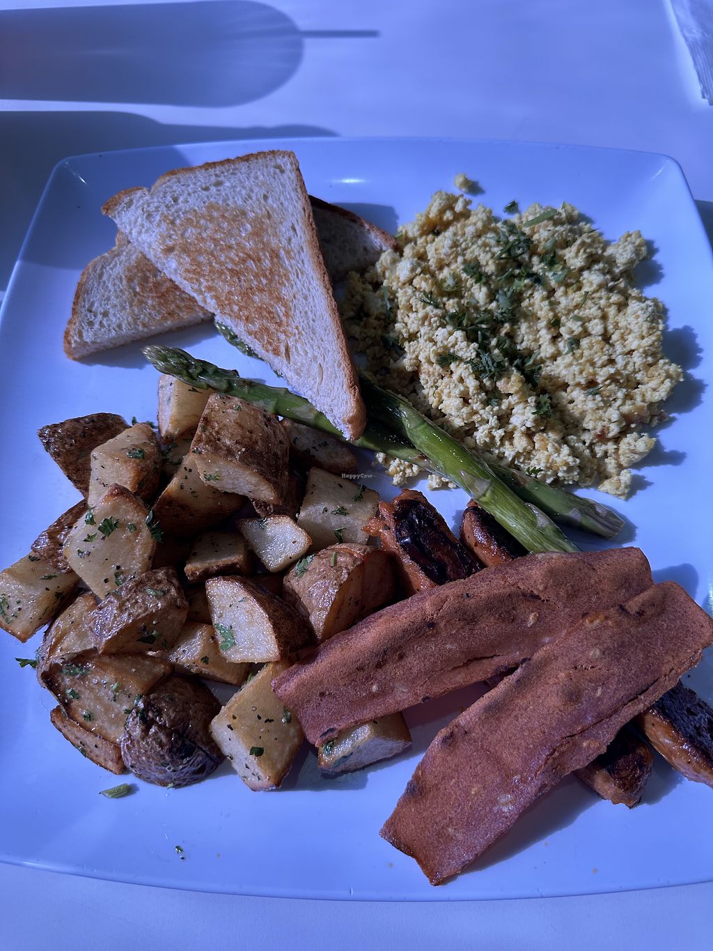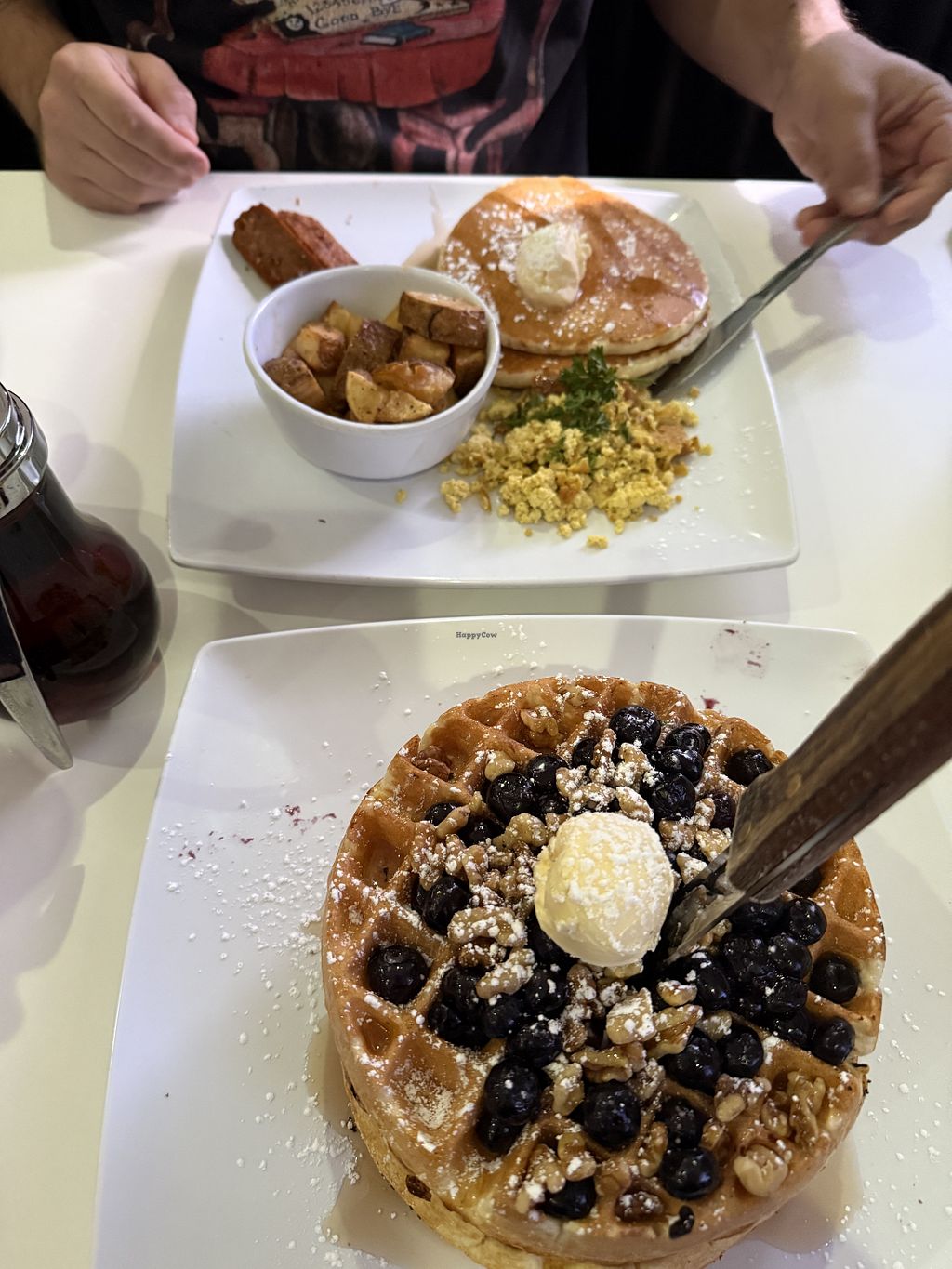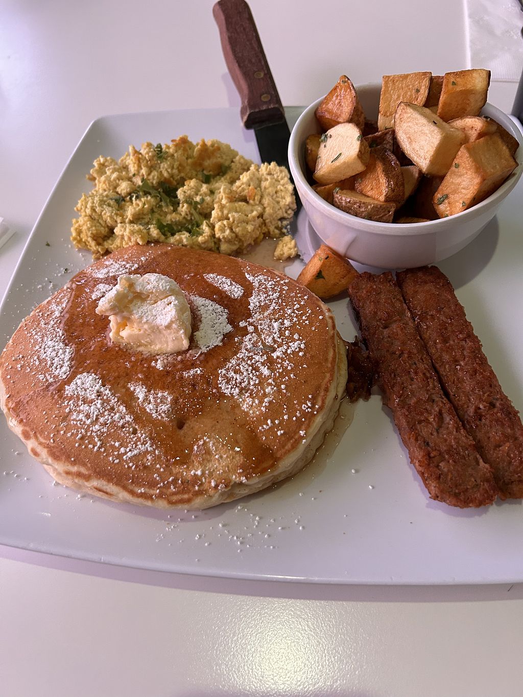 Amazing menu. I wish I could have been able to try more things because everything looked great. The scramble tofu was seasoned perfectly and the pancakes were super light and fluffy.