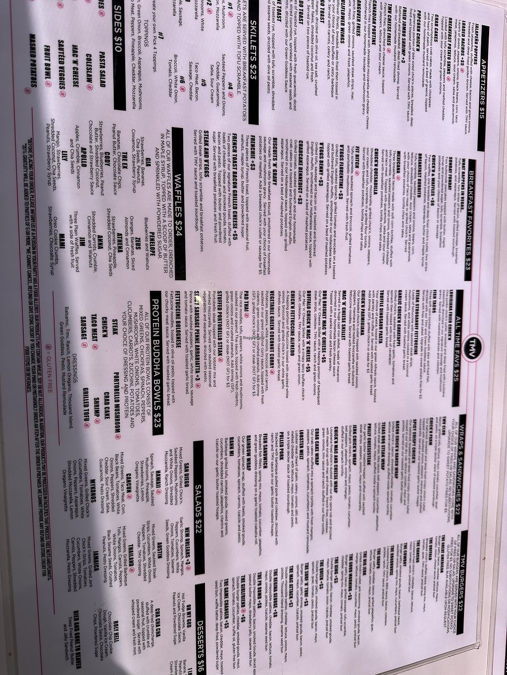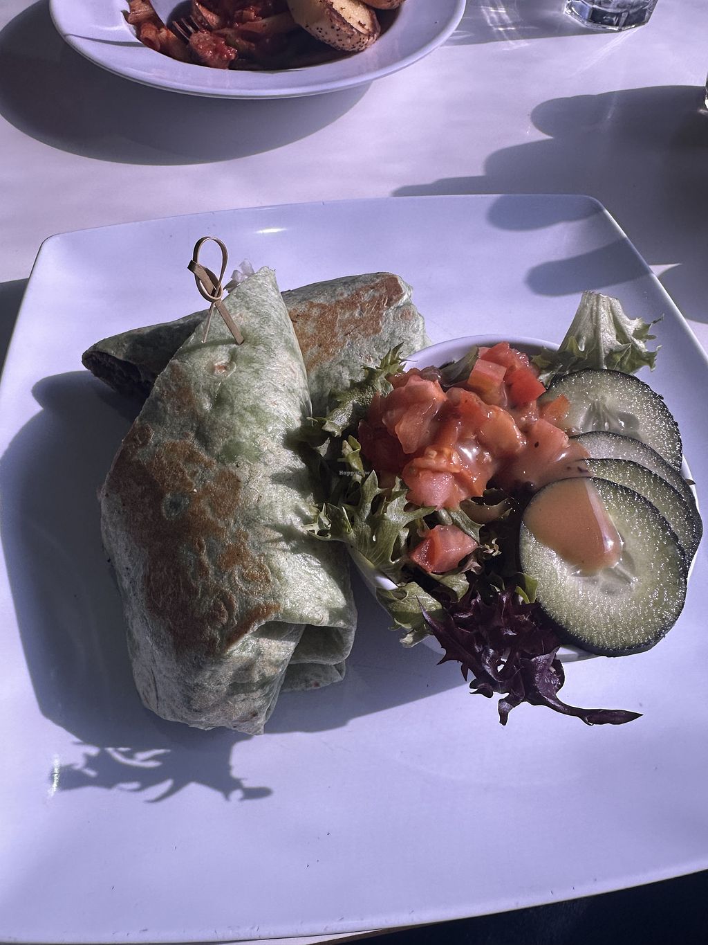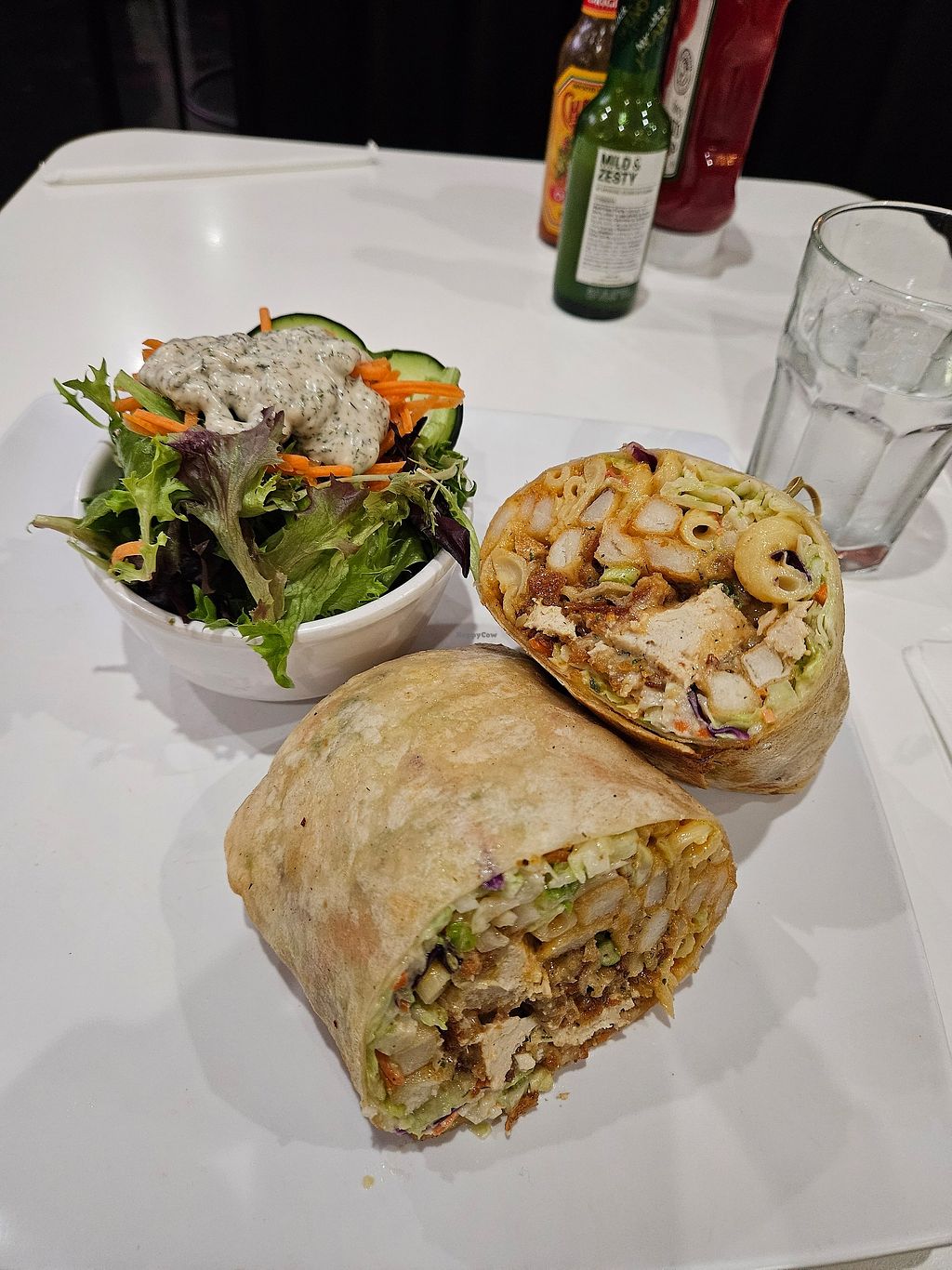 Had the crab cake wrap and side salad! There are a lot of creative menu items on the huge menu. Nice staff and the wrap was good.