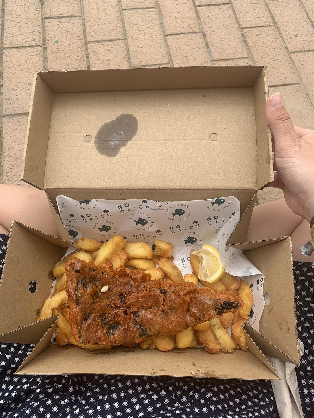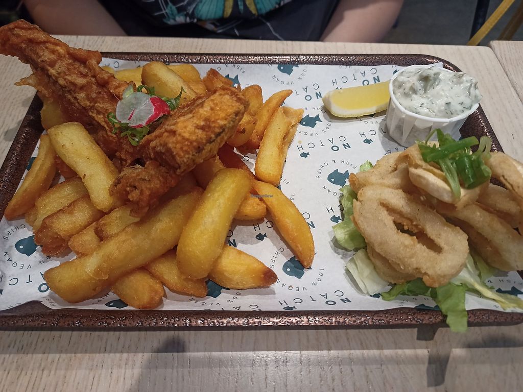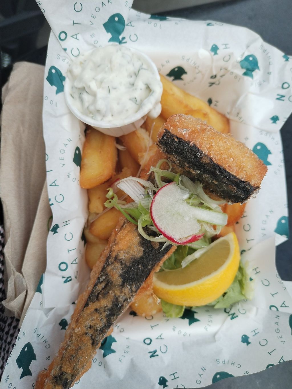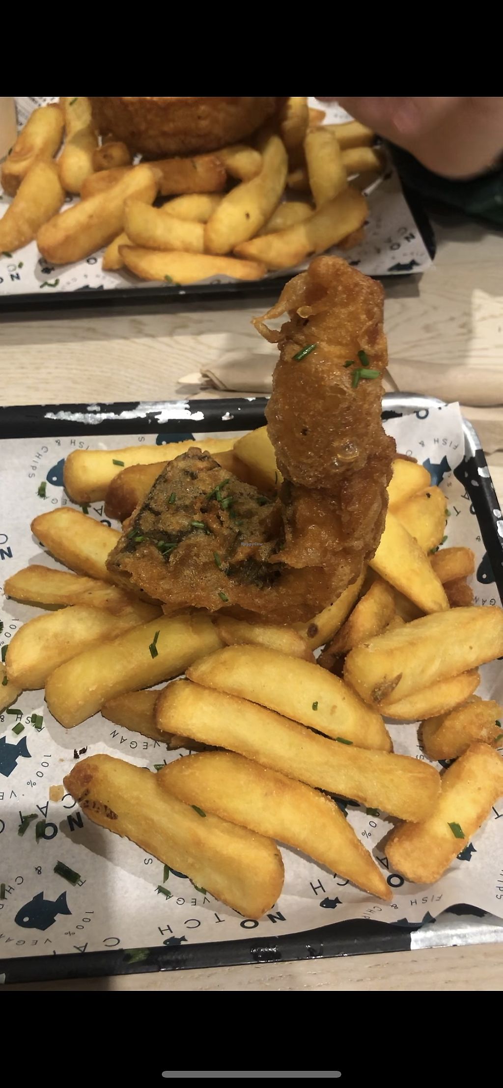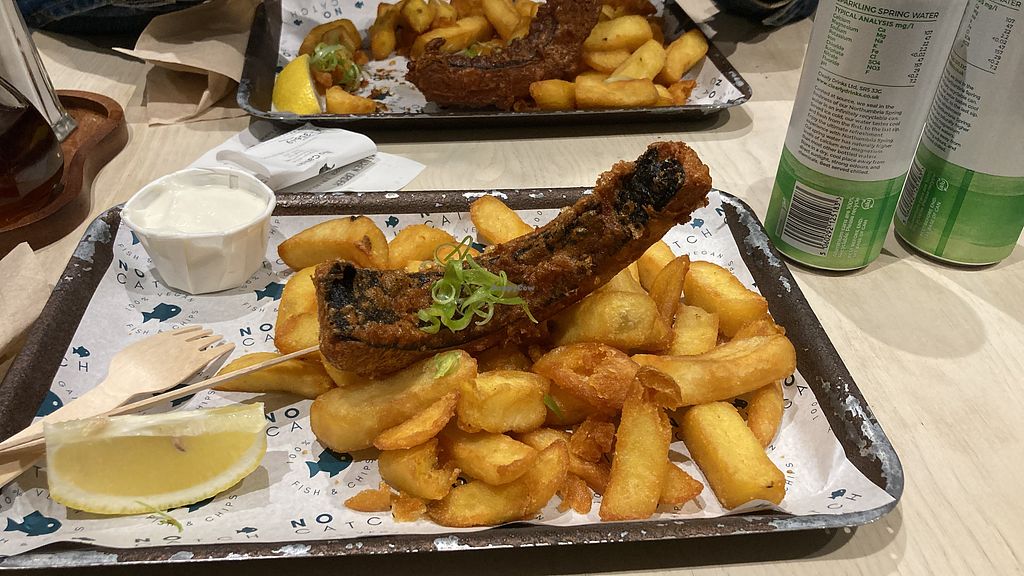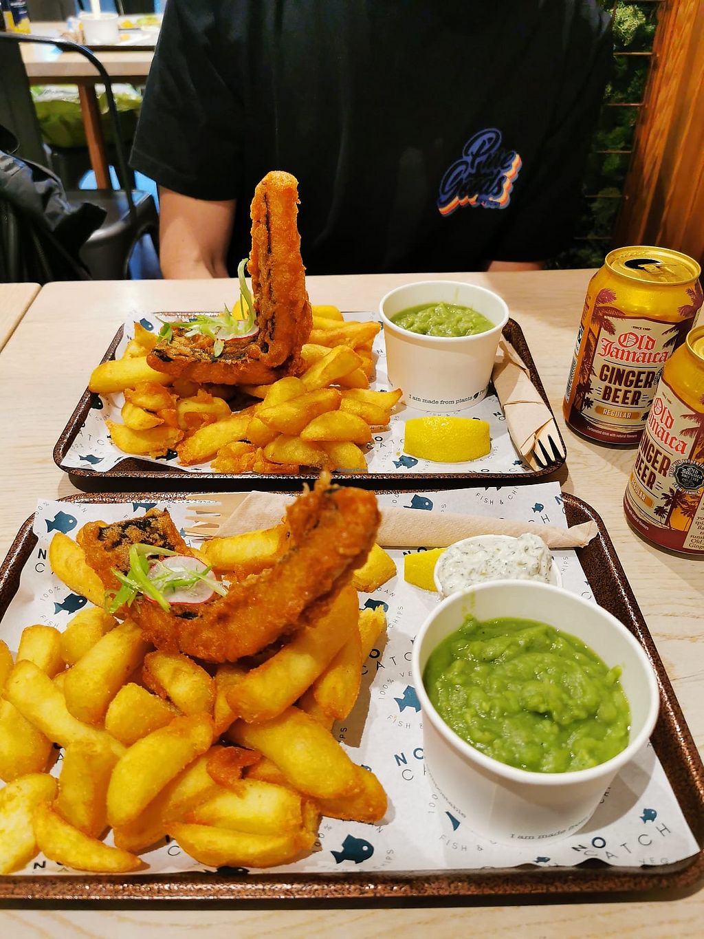 Classic cod fish & chips with mushy peas and tartare sauce.