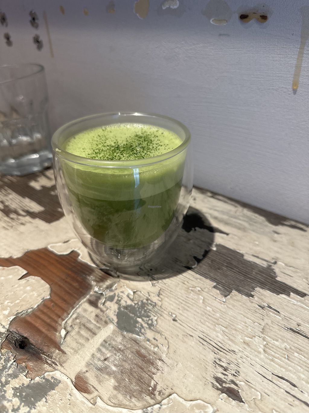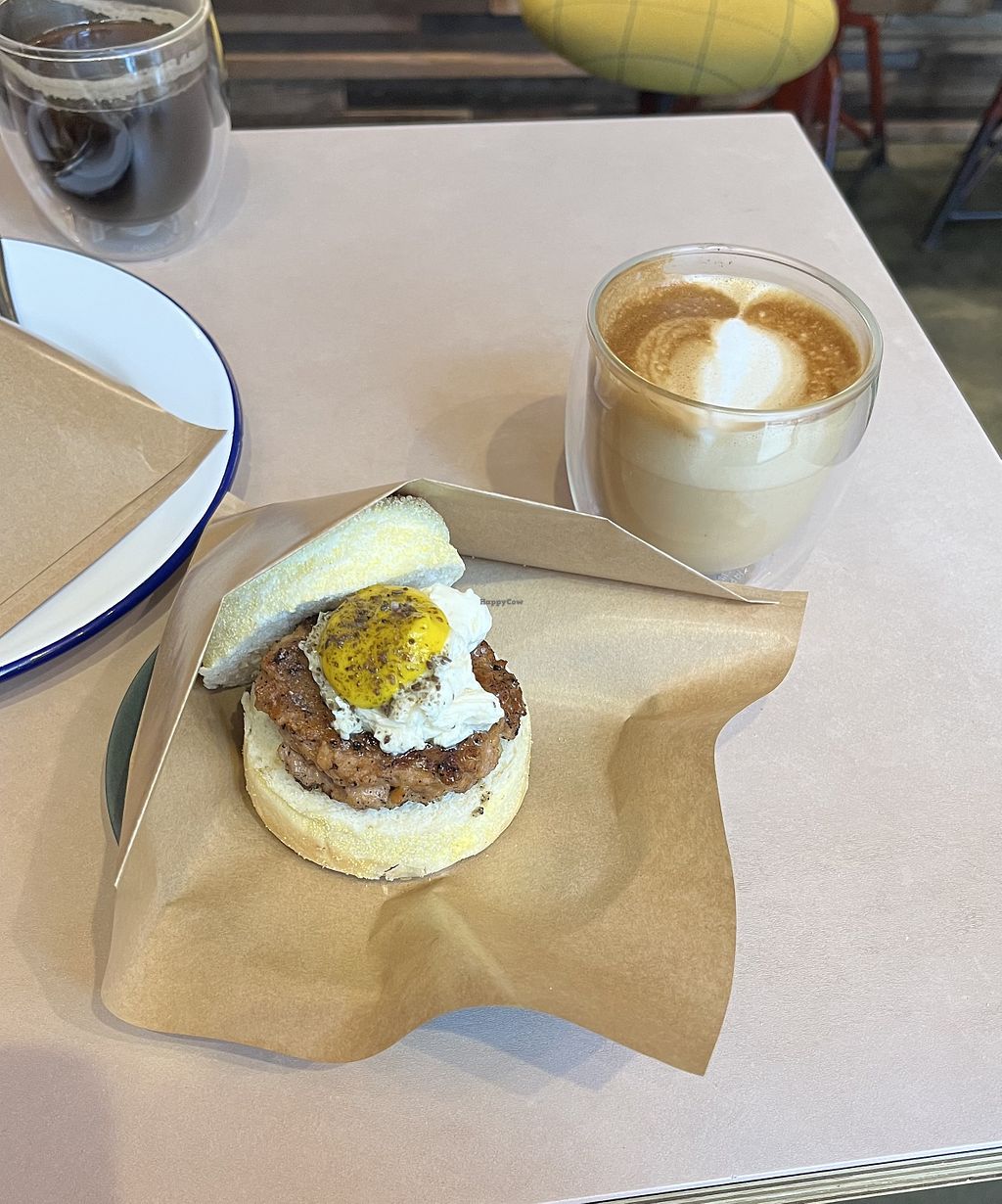 Grossartiger Frühstücksburger, Matcha und Macadamia Latte. Noch nie so eine gute Ei-Alternative gegessen! Wow