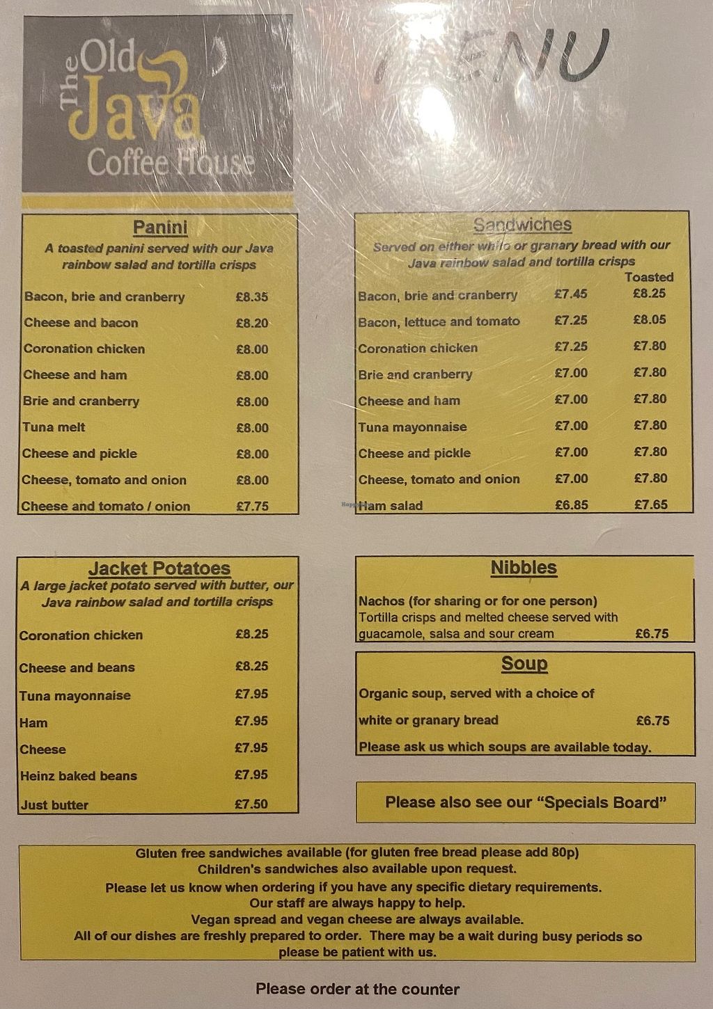 Read moreQuite a few veggie options including jacket potato's, panini or sandwiches, omelette, toast, cream tea etc. There are a few vegan options as they always have vegan cheese and spread. The vegan cheese and cranberry (or pickle too) panini is lovely! Amazing vegan hot chocolate and cakes. I tried the ‘oat of this world’ smoothies which was okay.