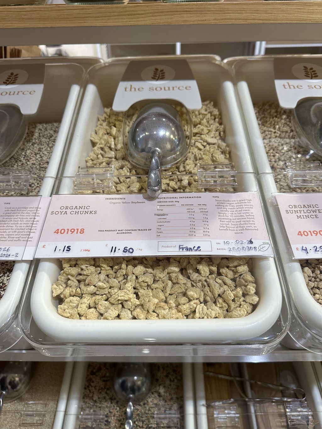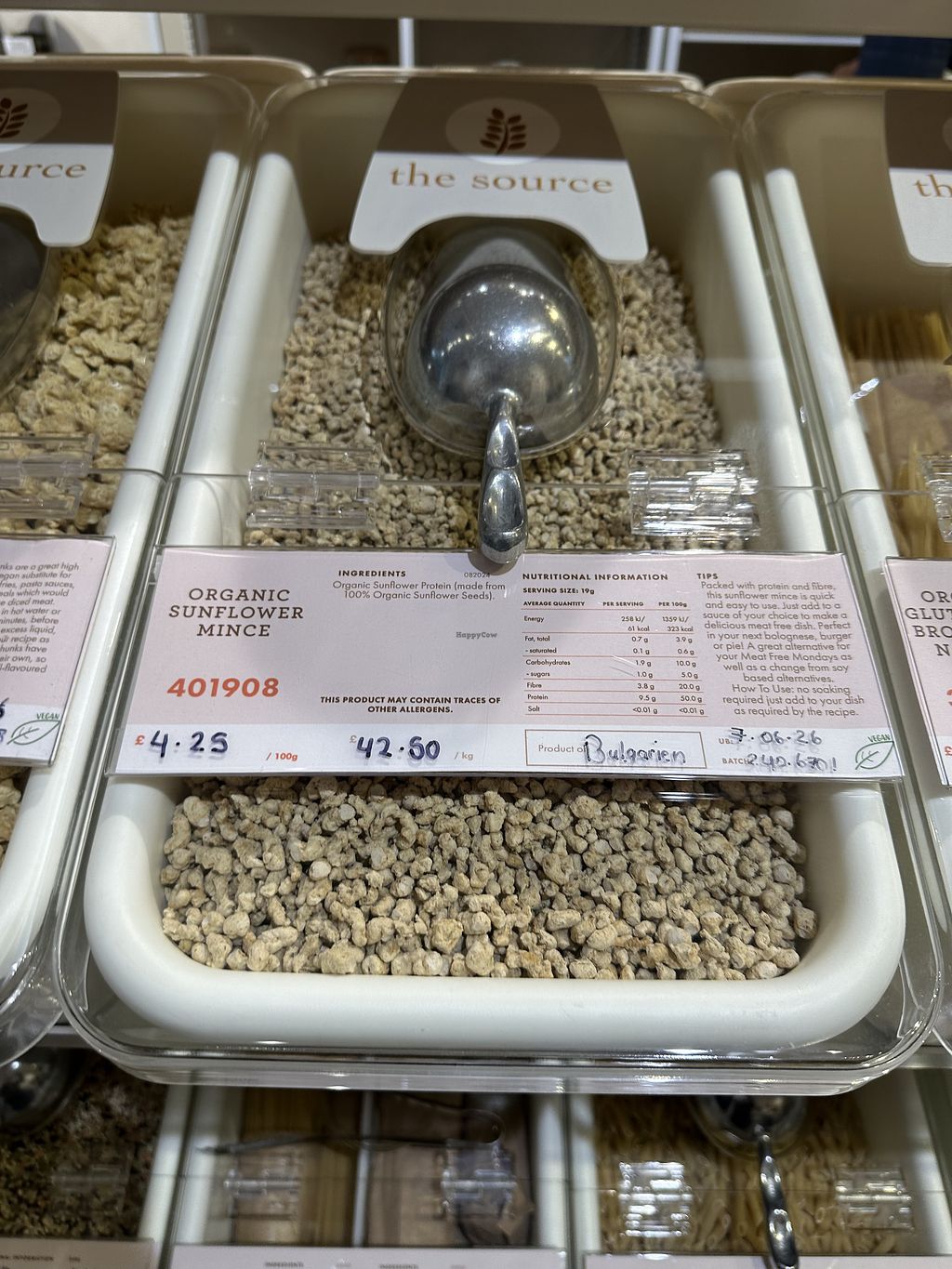 Absolutely amazing new bulk food store on Westbourne Grove! It was loaded with so many vegan products such as protein powders, protein mince, candies, staples, etc. we picked up some sunflower mince (never heard of it before!) and some almond butter. Very clean and neatly organized!