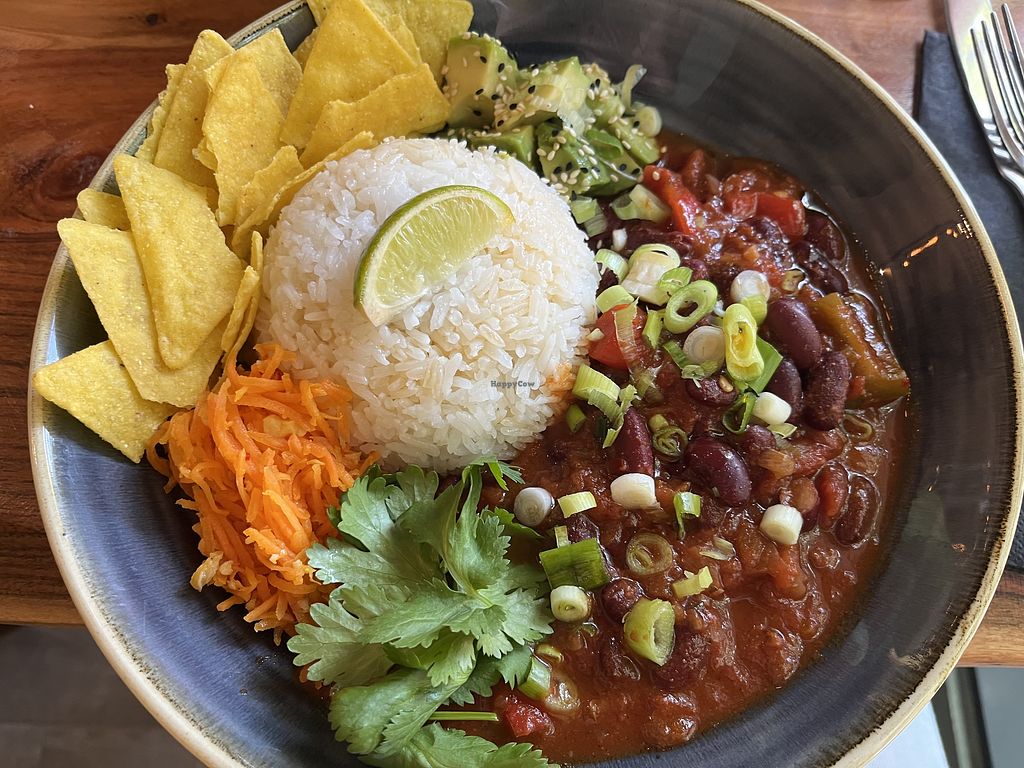 Great menu. Friend had lasagne and was pleased. I had chilli bowl which came with pickled carrot, salsa, rice, tortillas. Also kimchi was very tasty. Potato wedges chips were perfect with seasoning and mayo like dip. Glasses of decent wine.