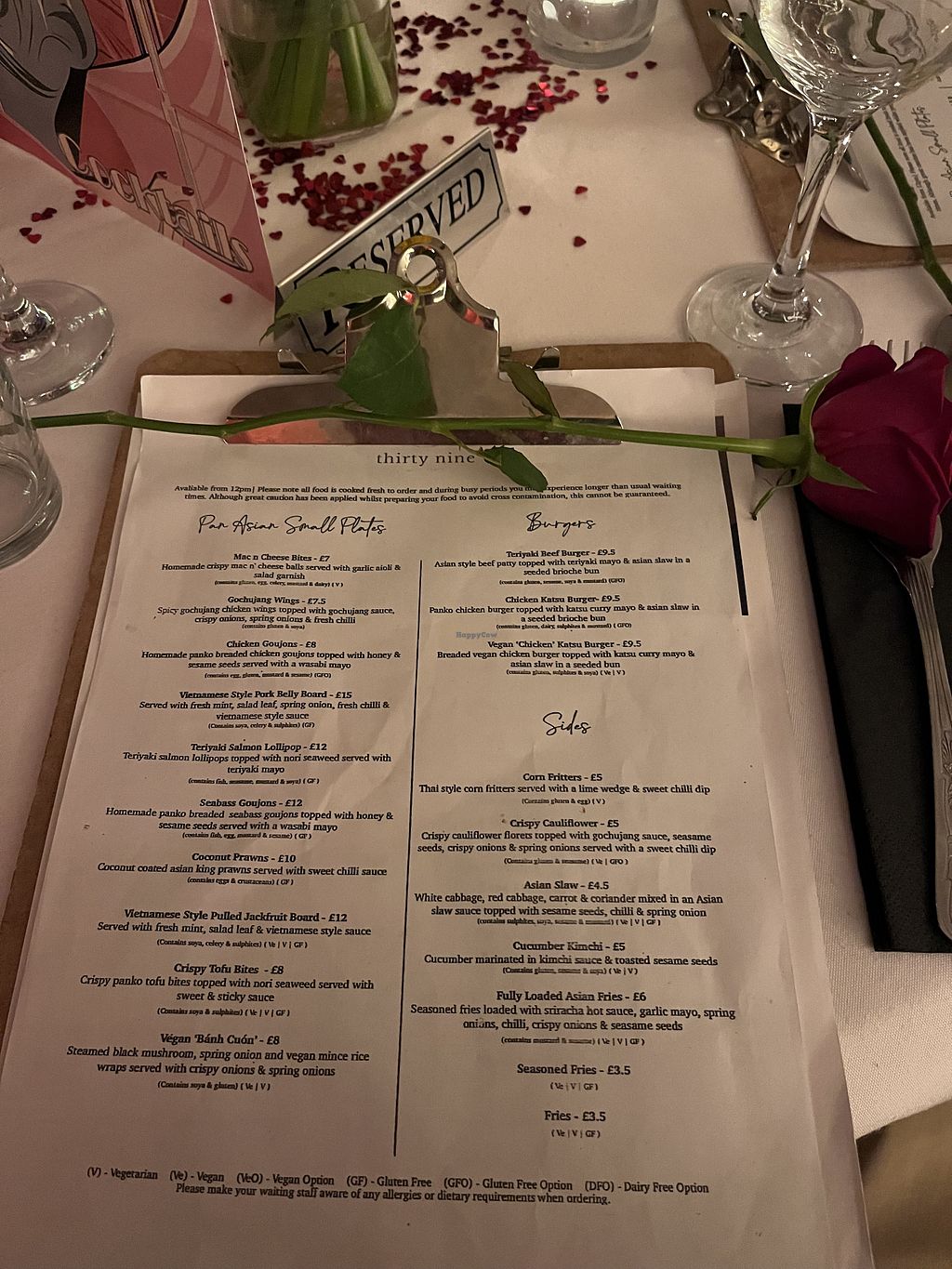 Went for dinner at thirty nine and was amazed at how many fully vegan options they have and how happy they were to make many other items on the menu vegan too. The staff were also super friendly and helpful. We will definitely be going back!