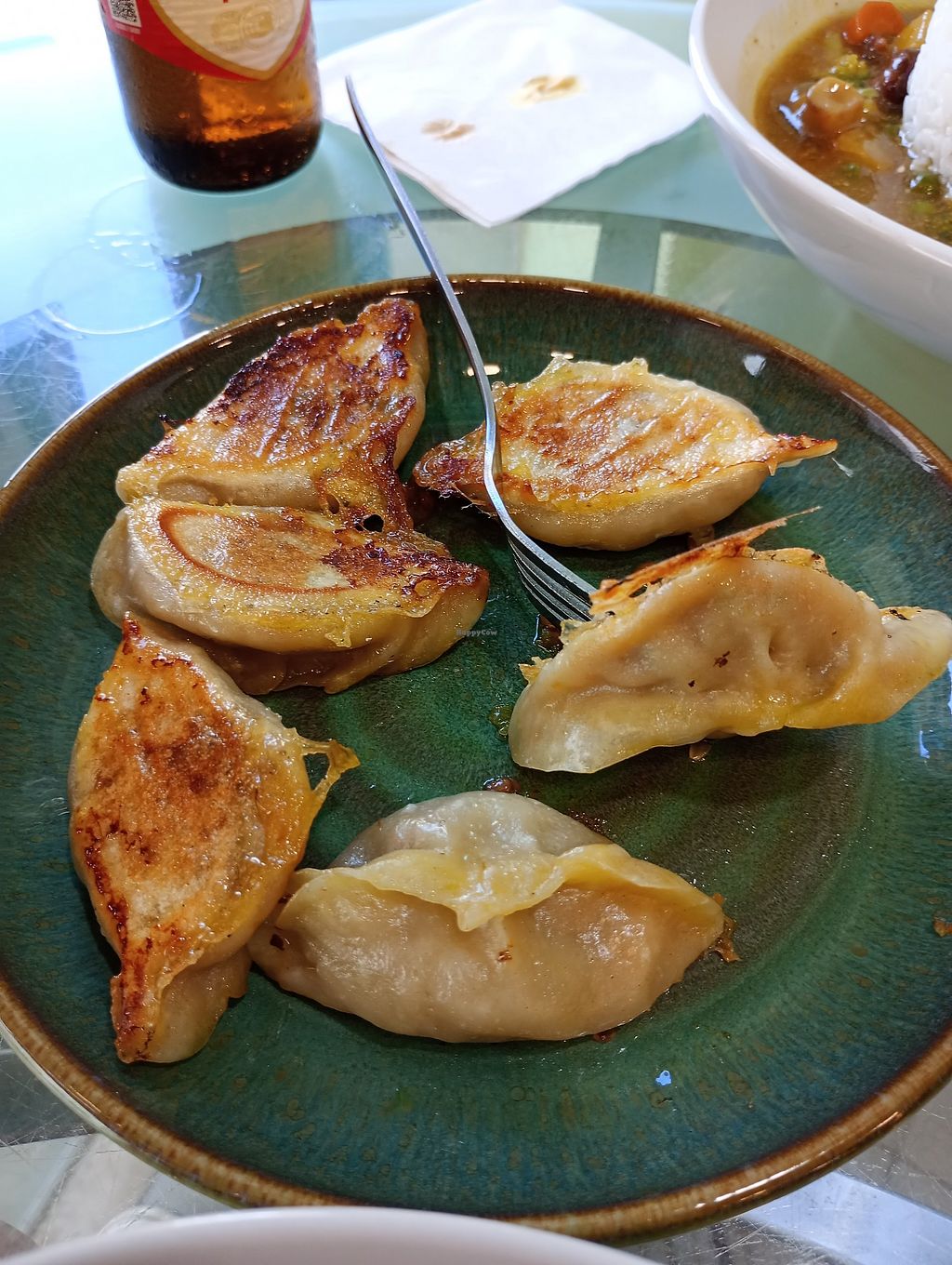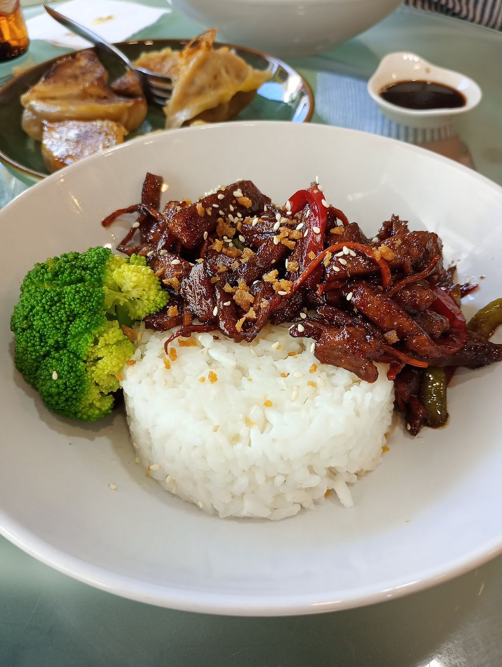 As main I had the same vegetarian meat substitute with veggies and rice, my GF had the roasted gyoza. Everything freshly prepared, excellent seasoned. Especially the meat.