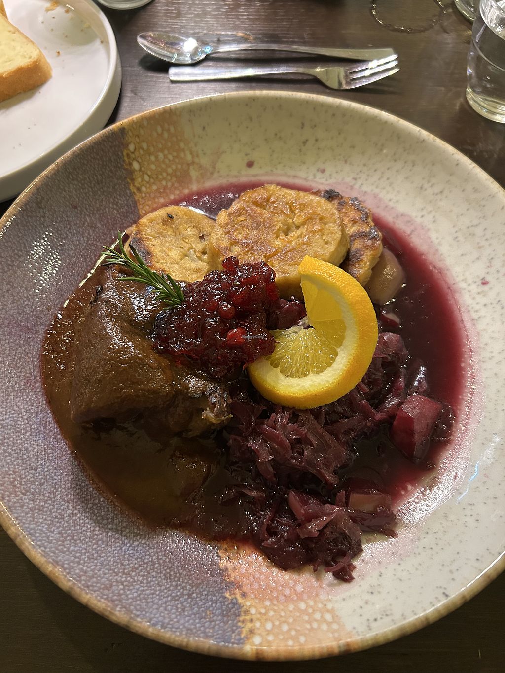 We had had "vegan goose" and were a bit disappointed. While it tasted quite okay the sauce was more like a lake, very watery and thin. The faux goose was far to soft and accompanied by only two and a half potato dumplings which were very small. And all that for almost 26 EUR.