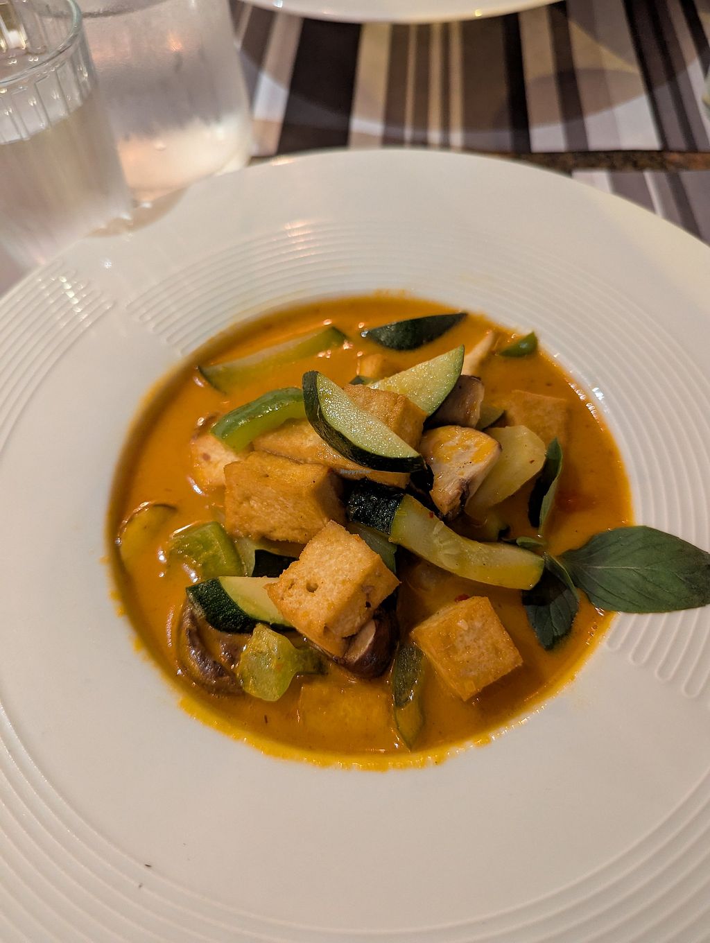 Serves meat, vegan options available. Asian fusion restaurant offering several veganizable dishes and a vegan dessert. Vegan options include tofu tom yum, tofu pad thai, garlic tofu cubes, and bananas in pajamas. Guests should specify they are vegan upon arrival to confirm which dishes can be veganized. Open Mon-Sun 18:30-23:00. Check time on google.