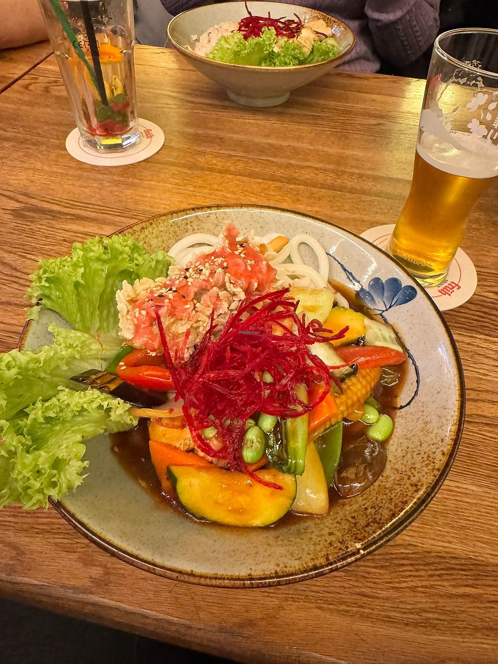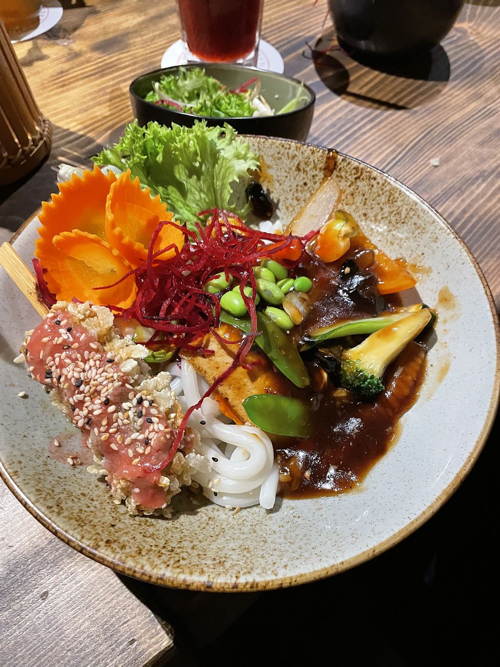 Sehr große Auswahl an veganen Vorspeisen (small bowls) und Hauptspeisen. Es gibt innen relativ viel Platz und wir haben Samstag Abend sogar noch einen Tisch für 5 Personen bekommen. Besser wäre es dennoch zu reservieren 😄 super nettes Personal und das Essen wurde schnell zubereitet und gebracht 🤩 mein Favorit ist immer der Tofu welcher mit Reis flakes ummantelt ist. Die Udon Love Bowl war auch mega mit schön viel Tofu 🥰