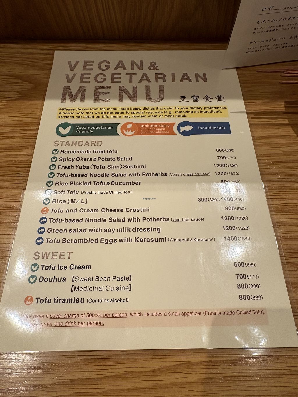 Despite being a restaurant specialising in tofu and seeing vegan mazesoba in a previous menu, they said there were no vegan options other than the pickled tofu, cucumber and soy beans. They use meat in all their broth and marinade.