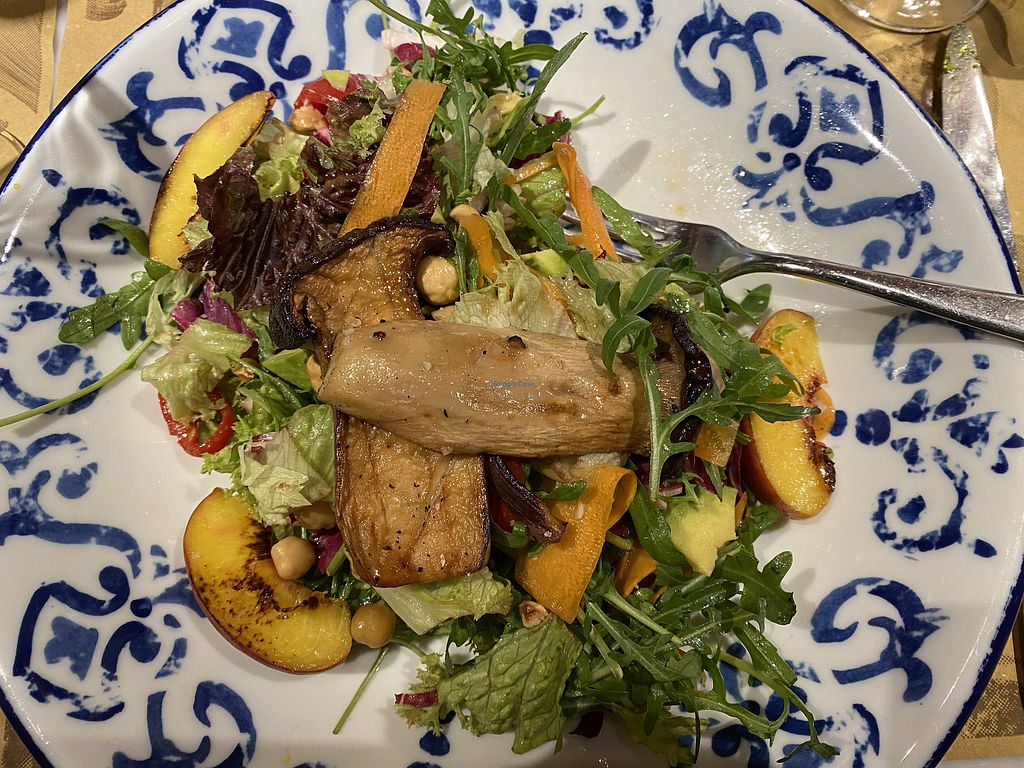 I wasn’t super hungry, so I asked if they could do a medium sized salad with some tomatoes and other vegetables. The chef created a super tasty salad with grilled peaches, tomatoes, carrots, chickpeas and hazelnuts plus oyster mushrooms on top (I already ate some of it before taking the picture).