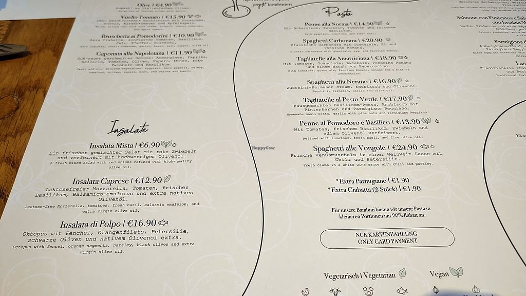 Serves meat, vegan options available. Gluten and lactose-free Italian restaurant with clearly labeled menu. Example vegan offerings include vegetable pasta, bread with oil, seasonal soup, salad and more. Open Tue-Thu 12:30-22:30, Fri-Sat 12:30-23:00, Sun 12:30-22:30. Closed Mon.