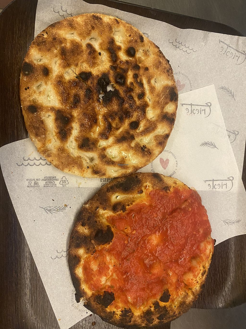 Il n’y a que peu de choix. Une pizza avec de la sauce tomate. Et la même avec des olives. Ainsi que les versions sans gluten (pas disponibles lors de notre venue). Possibilité d’avoir de la pâte à pizza seule avec huile d’olive et sel.