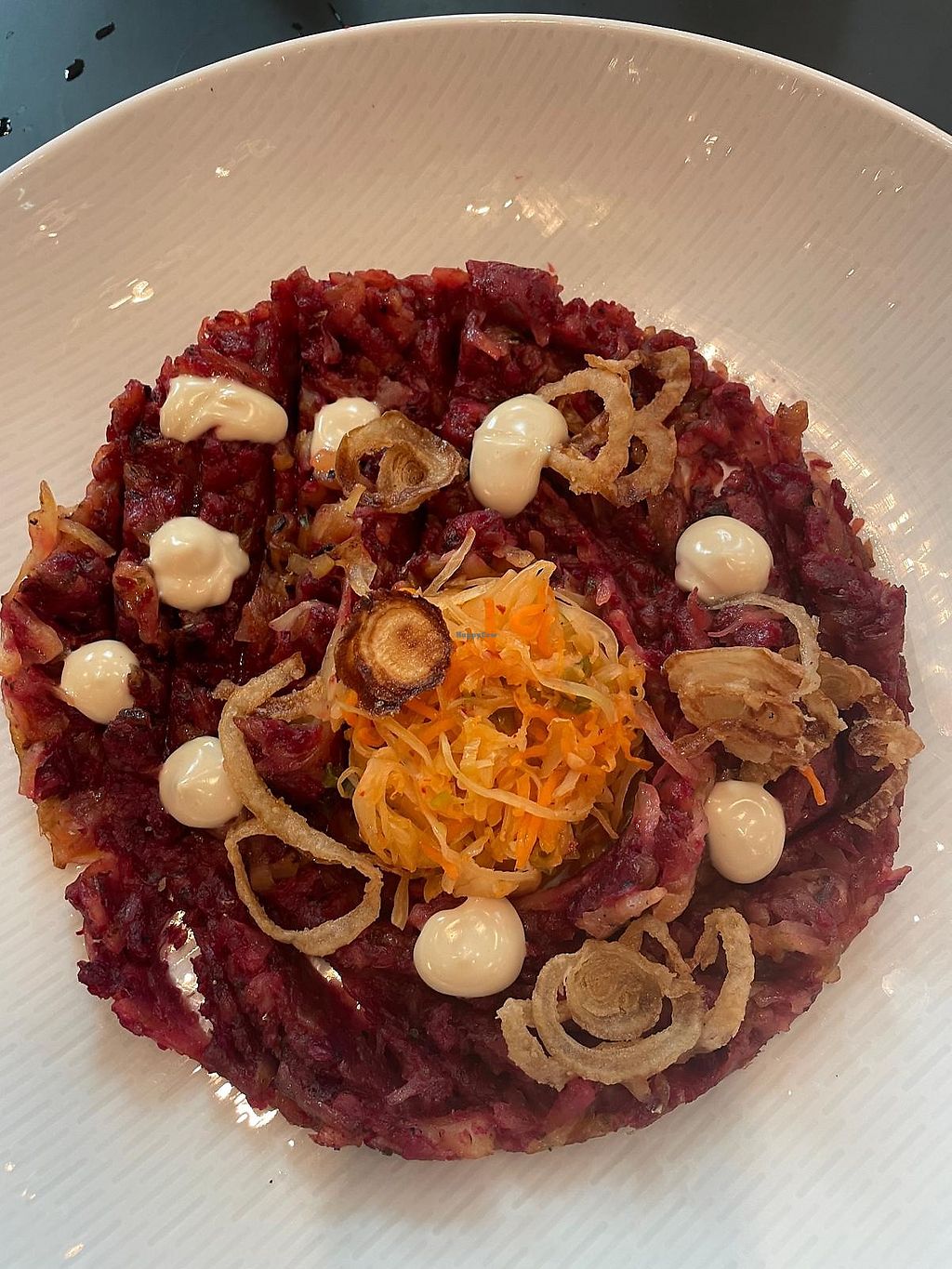 Best meal I've had in a long time. Great and interesting veggie & vegan options. I had grilled cabbage and rice pudding (both vegan) and passionfruit lemonade. All delicious. €35.80 (including tasty bread and butter) and worth it. It's a nice place with a nice vibe when I was here, too. Some nice blurb on the menu about sustainability, sourcing local ingredients etc