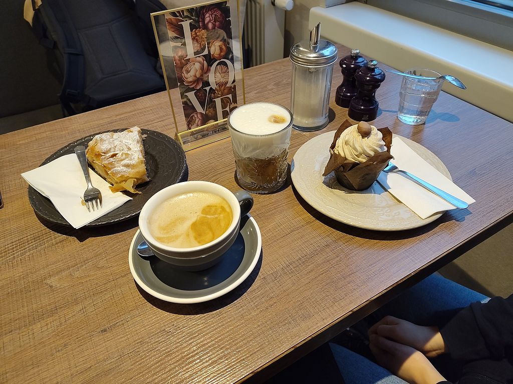 Kaffee mit Pflanzenmilch möglich, vegane Frühstücksoption und verschiedene vegane Backwaren. Apfelstrudel, Oreo Brownie und Lotus Cupcake.
