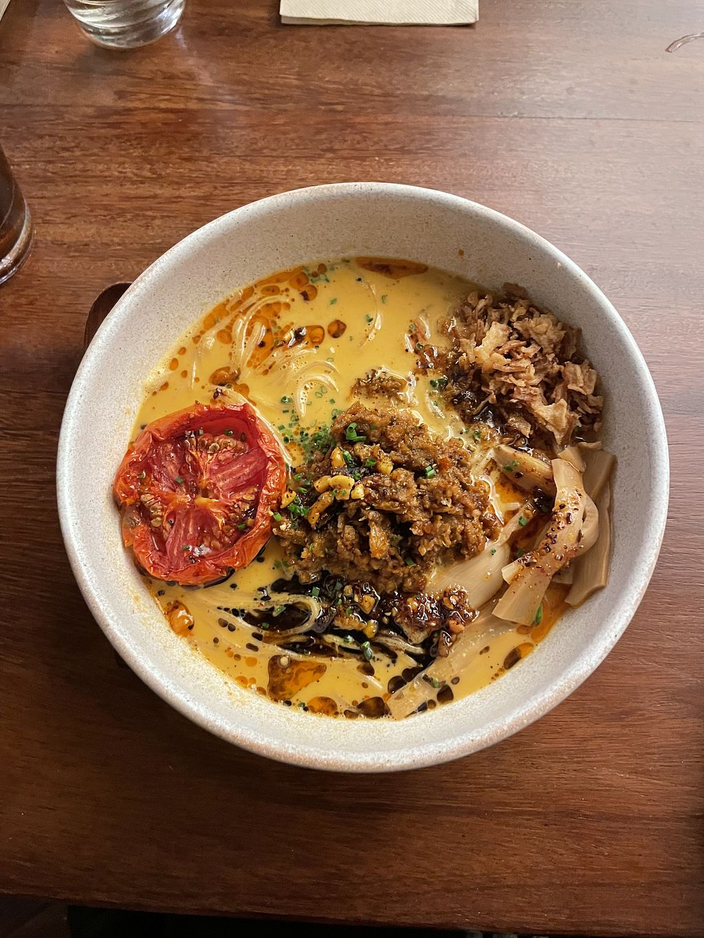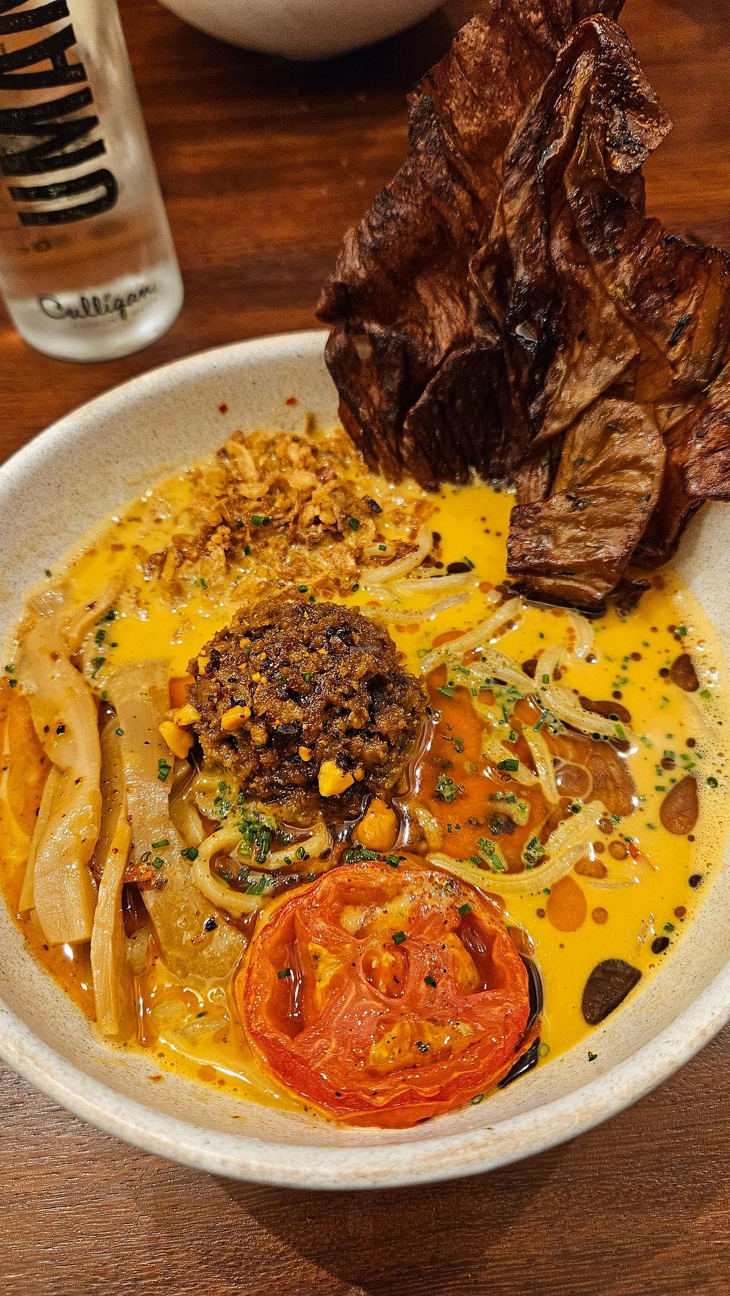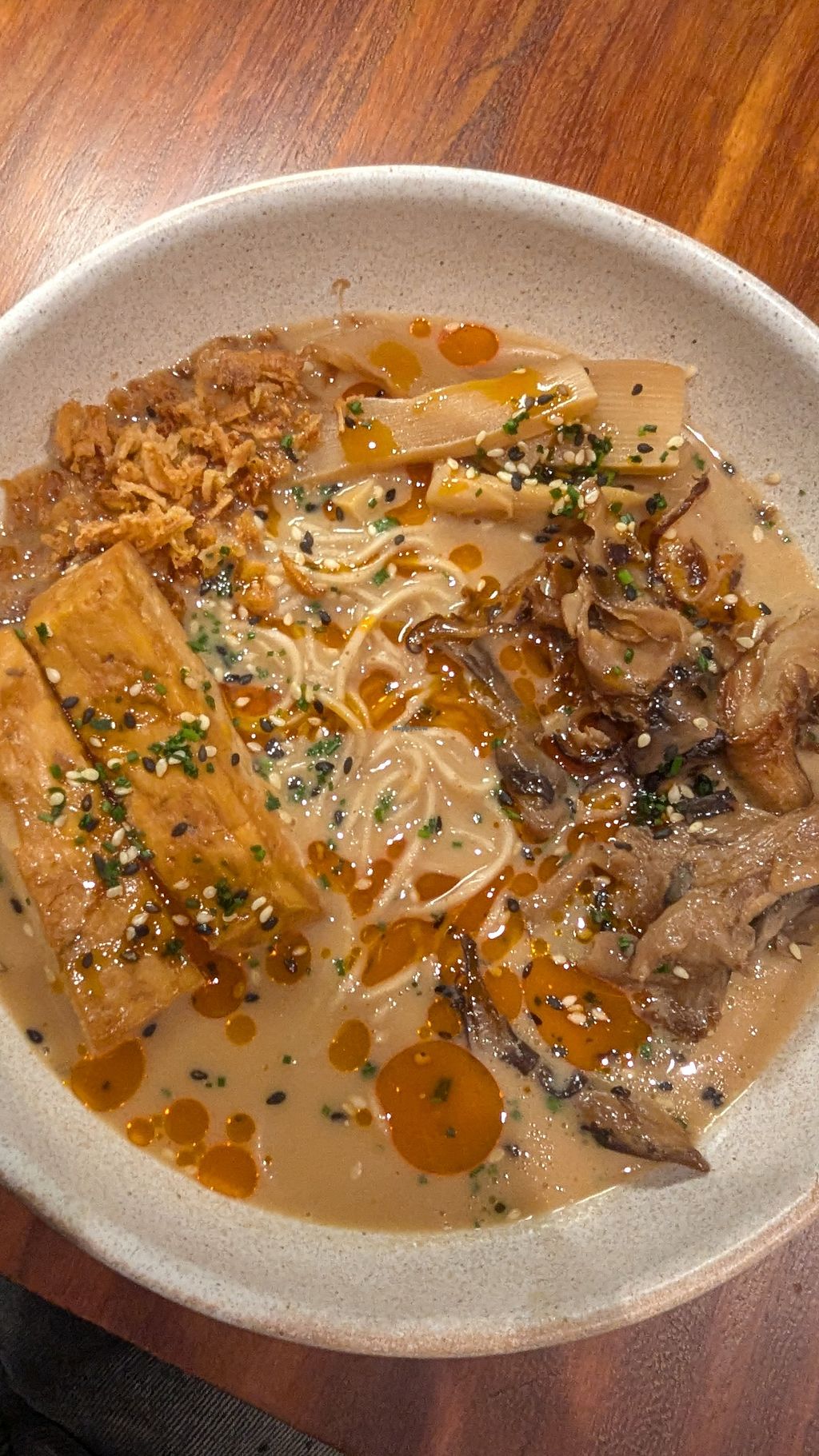 The expectations for what's described in many reviews as "the best vegan ramen they've ever had" were off the charts. Met 100%! It truly is the best ramen I've ever had, vegan and non-vegan. I can't even describe the flavours, textures and overall impression of it. I had the creamy mushroom option with crispy chicken skin (made from yuba). I'll dream about it for months, probably. The gyozas were insane, the amount of different flavours in such a small bite still blows my mind. The desserts were incredible, too. I'll definitely come back to try absolutely everything they offer.