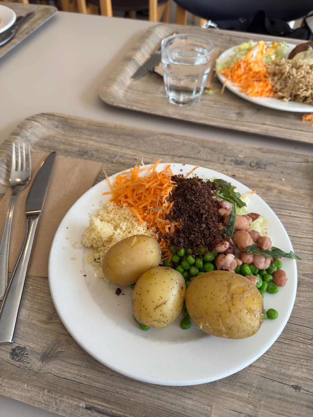 It's a Student restaurant and unfortunately there isn't much options but you can make yourself a salad. if you're luck they'll be a warm meal but it wont taste very good