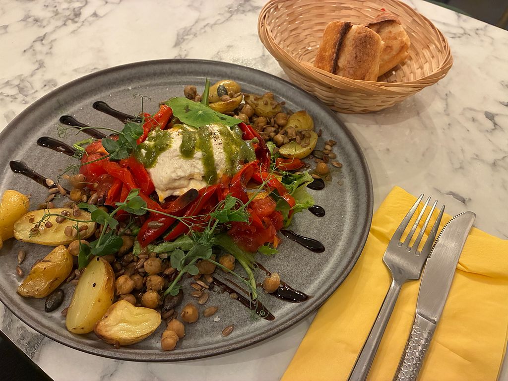 Homemade mozza, old tomatoes, candied red pepper, pesto, potatoes, and…