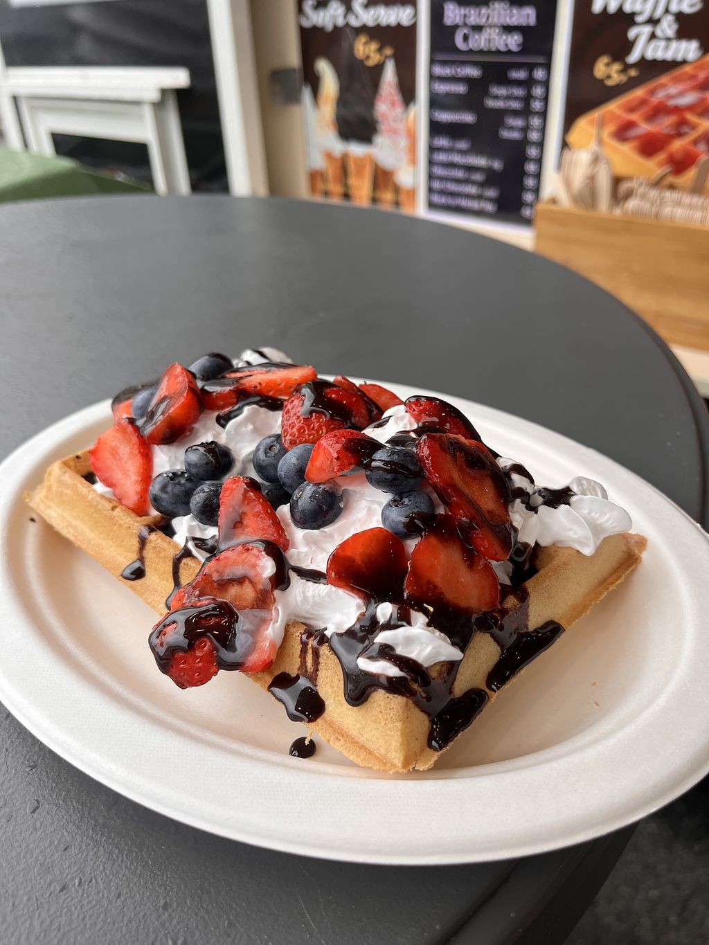 The waffles are vegan and there are a few vegan toppings to choose from too, including vegan whipped cream. The server was extremely nice and recommended a vegan restaurant.