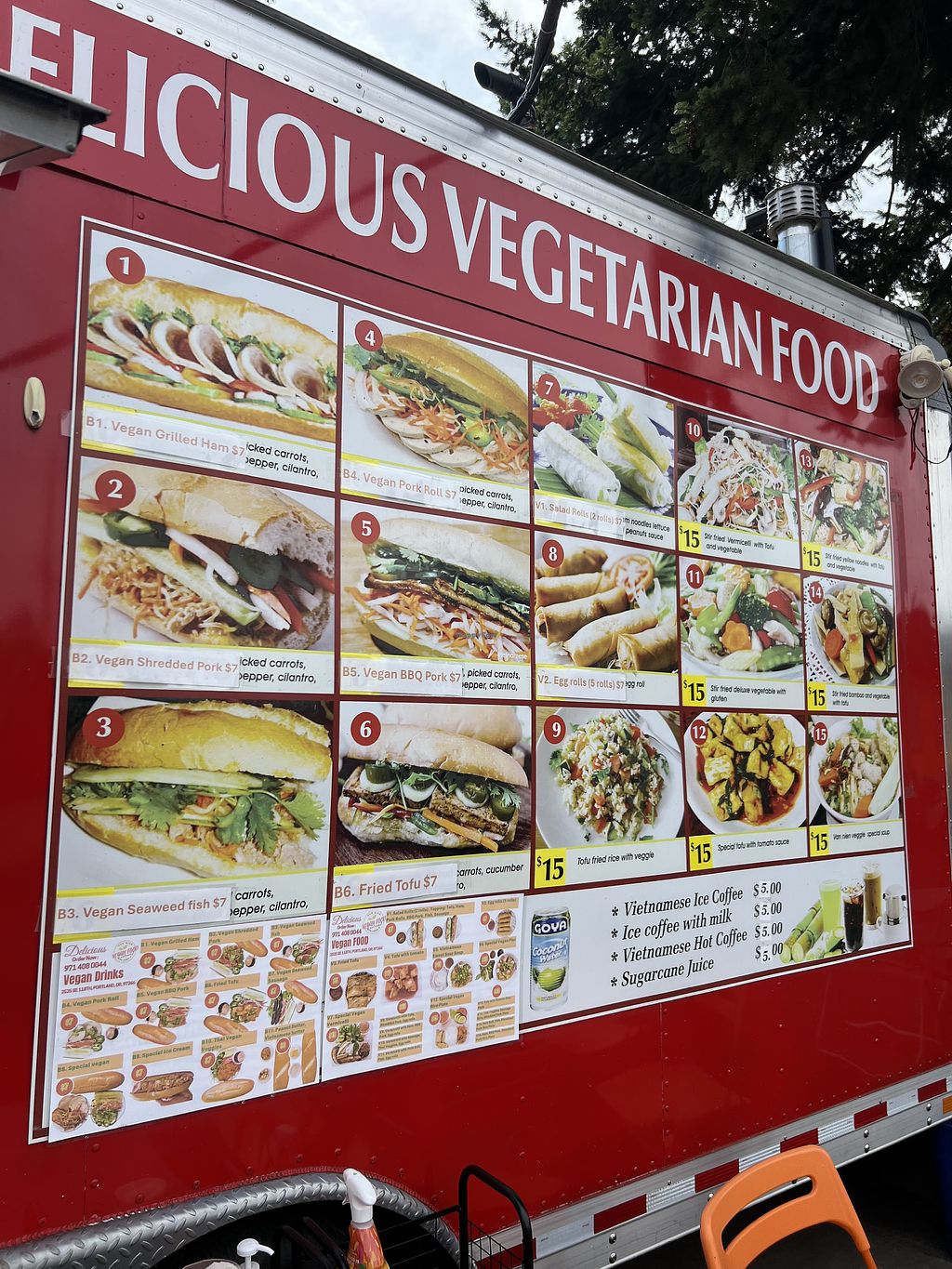Vegetarian food cart selling Vietnamese food. Menu shows photos of each dish such as stir fries and sandwiches with tofu and mock meats, many of which are vegan. The mayonnaise is VEGAN.