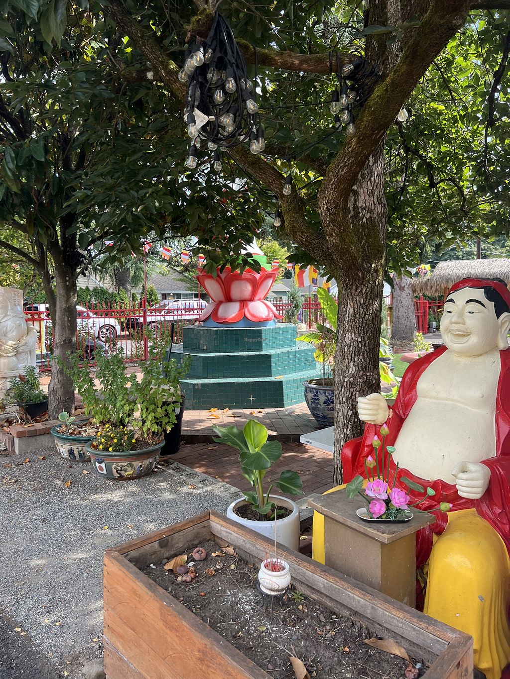 Located next to a Buddhist temple this small cart is connected to a covered space. The grounds are peaceful with interesting plants and statues.