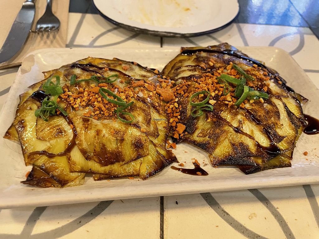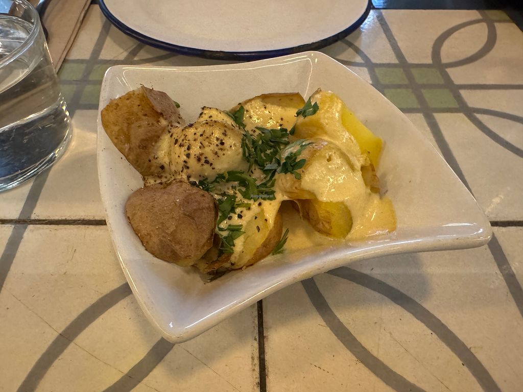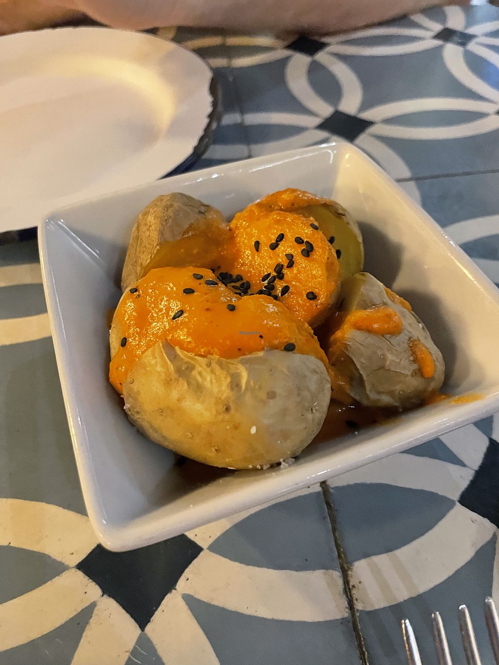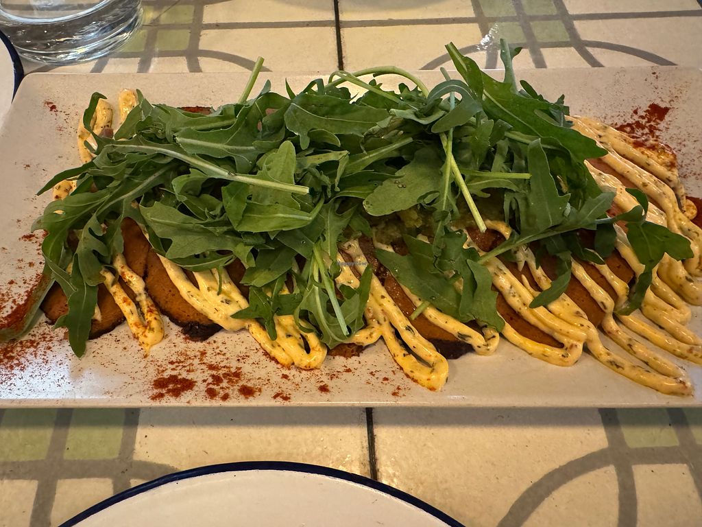 Everything is vegan but this restaurant serves food that anyone would consider delicious. We had the mushroom croquettes and grilled artichoke appetizers. We followed that by a shared burger that came with roasted potatoes and finally, cheesecake. A very nice Patatas bravas dish was served with our drinks.