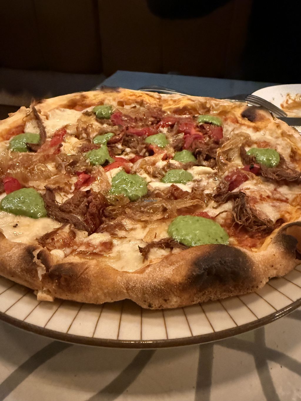 I loved the pizza I got. The cheese is cashew based (I believe) and fermented, and had a really stretchy consistency. The meat was also tasty and very nice seasoned. Got a little appetizer as well :)