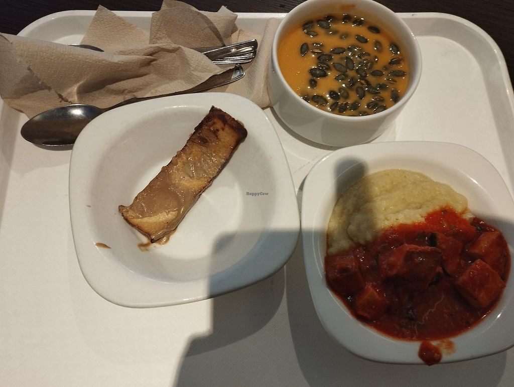 Cream cake, layered potatoes with cashew cream and mix of tempeh, seit…